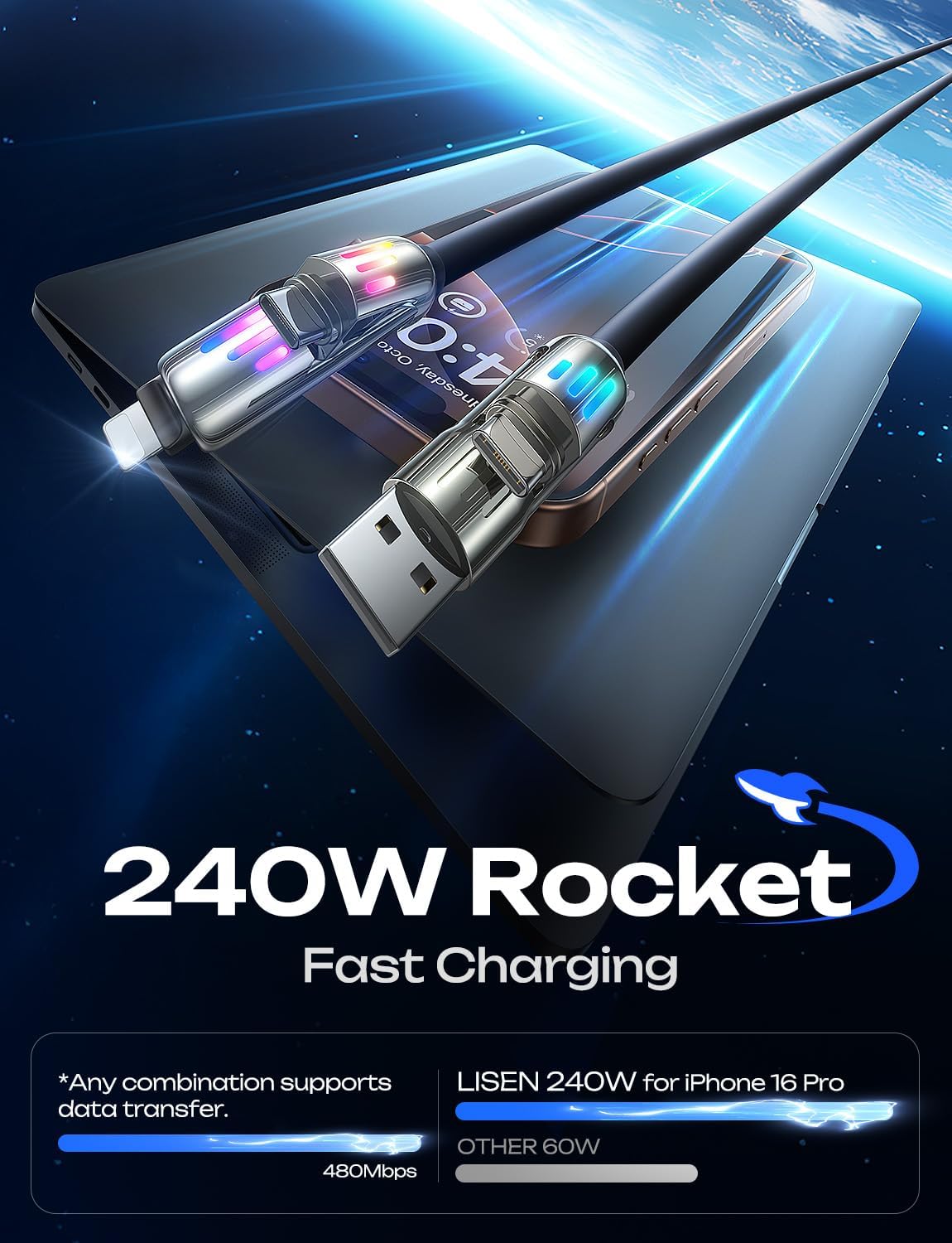 - [What You Get] LISEN 10FT 240W 4-in-1 Multi Charging Cable, a length suitable for any situation, so you no longer need to stay near a power outlet. Additionally, our reliable customer service is available 24/7—if you have any questions or issues, feel free to contact us. We guarantee resolution within 24 hours. Please note, the 240W Type-C cable can power laptops through the Thunderbolt port, but it is not a USB 3.0/4K cable.