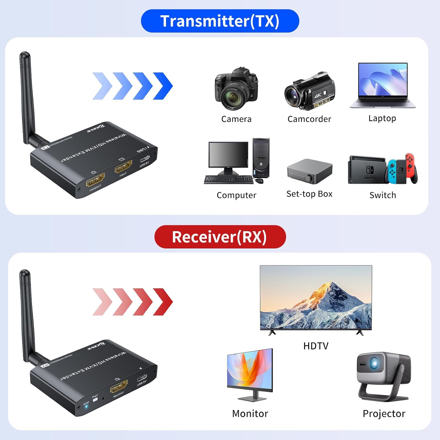 - ăKVM 1 Computer 2 HDMI Monitors USB ExtenderăKCEVE KVM HDMI USB Extender could control 1 computer to share 2 HDMI monitor and keyboard mouse. Connect USB cable to the computer to power the Wireless HDMI Transmitter (TX) and transmit USB signals to the Wireless HDMI Receiver (RX), and use DV 5V 2A to power RX to realize the mouse and keyboard functions