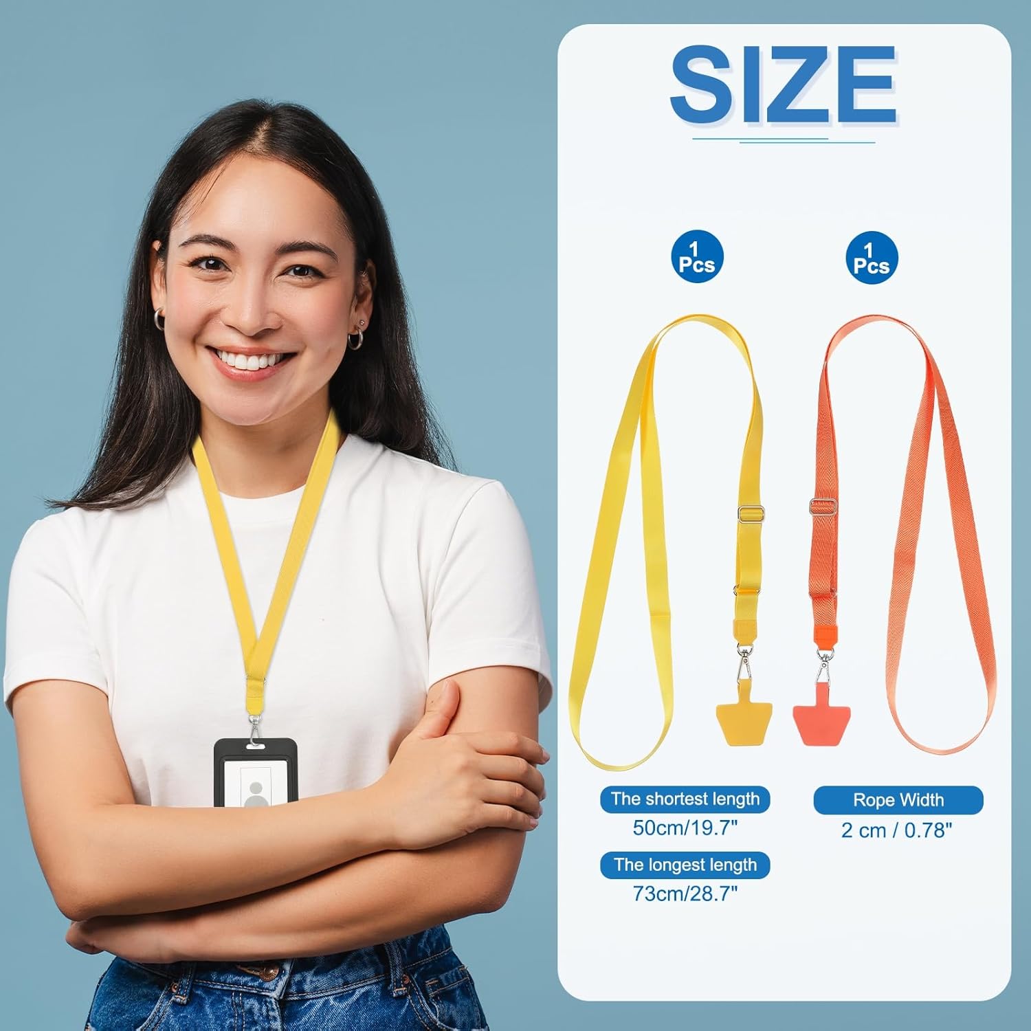 - Specification: Color: Yellow/Orange; Material: Polyester; The longest length is 73cm/28.7 inches; The shortest length is 50cm/19.7 inches; Rope Width: 2 cm / 0.78 inch; Packing List: 2 Pcs x Smart Phone Lanyard; 2 x Phone Patches.