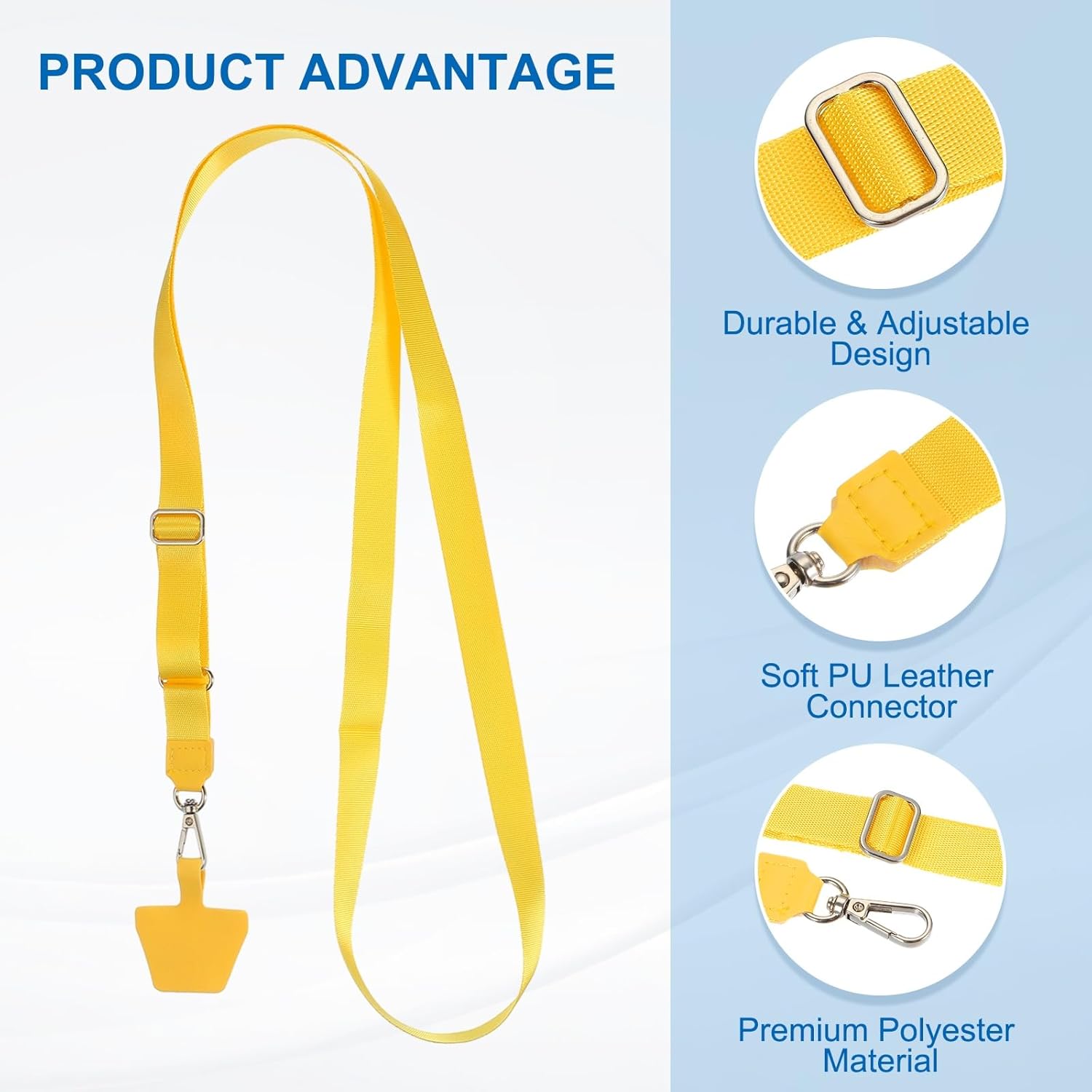 - Premium Polyester Material. Lightweight, water-resistant, and soft against the skin for all-day comfort. Crafted from tear-resistant polyester fiber with a smooth, breathable finish, this lanyard features a secure phone patch that fits most cases. Use it as a neck strap, crossbody carrier, or bag attachment. Suitable for smartphones, keys, ID badges, or small tools—perfect for gym-goers, travelers, office workers needing hands-free convenience.