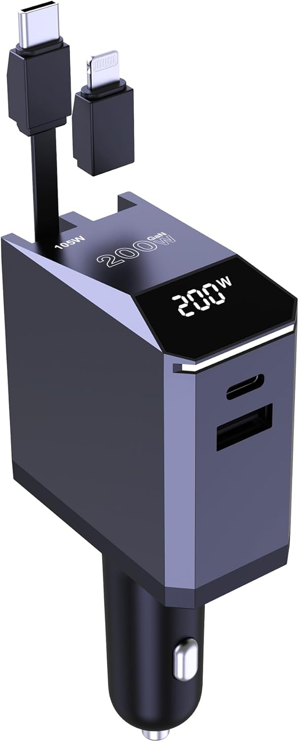 - Retractable USB C Car Charger: Built-in 2.3ft retractable USB C cable delivers 105W super charging, combined with 35W USB-C and 60W USB-A ports for 200W total power output, rapidly charging laptops, phones, tablets, or other devices simultaneously