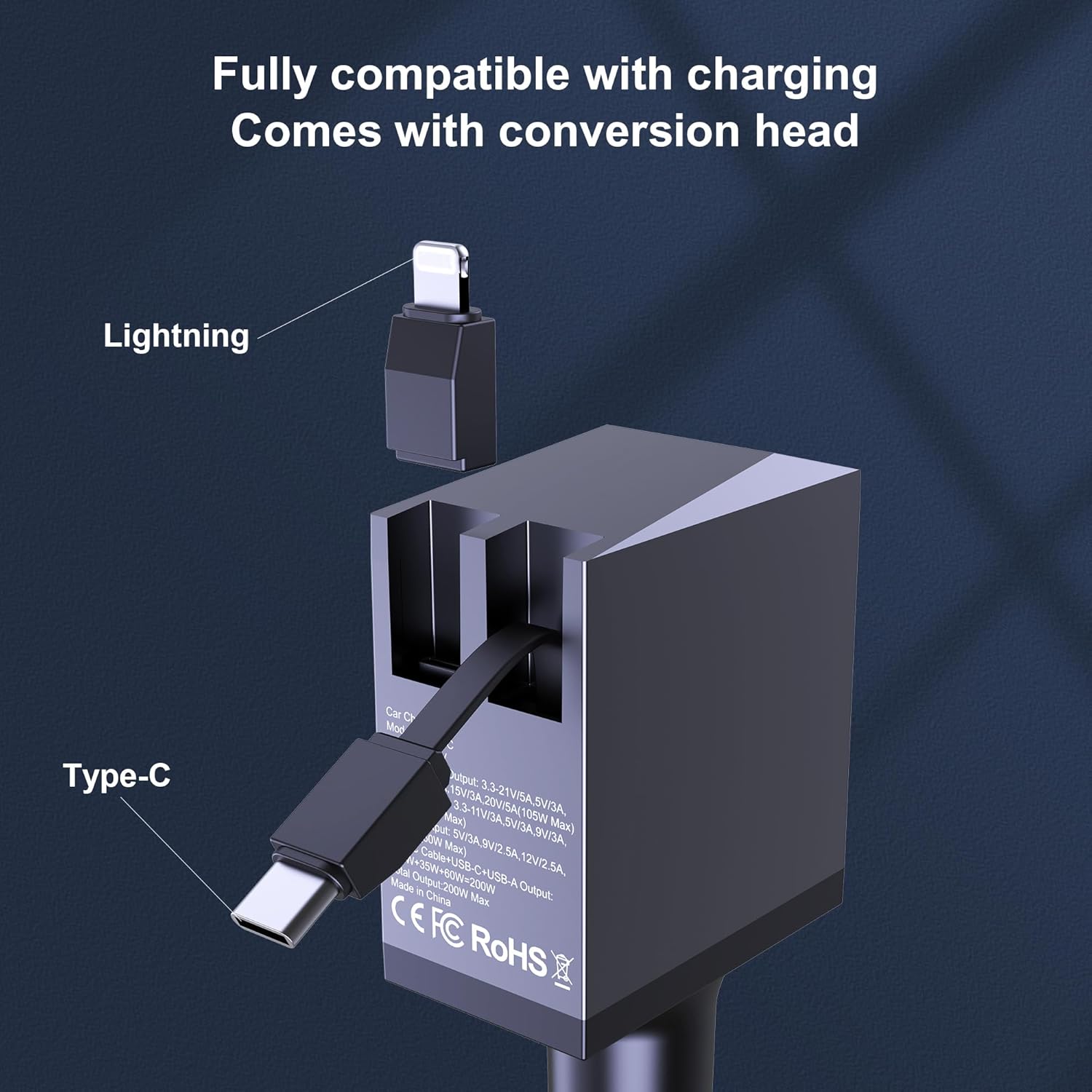- Please Note: The 200W car charger does NOT come with an iPhone cord. It is just an iphone-compatible plug, needs to be plugged into the Type-C port for use