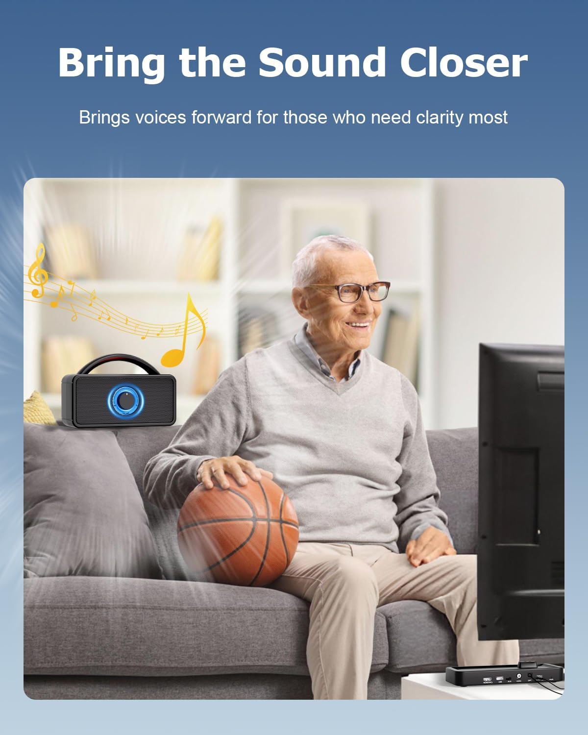 - 【 Portable and Lightweight Design 】Carry it room-to-room — bedroom, kitchen, patio. The compact wireless TV speaker follows you wherever you go. A large volume knob, simple indicators, and intuitive controls make it easy to use for all ages