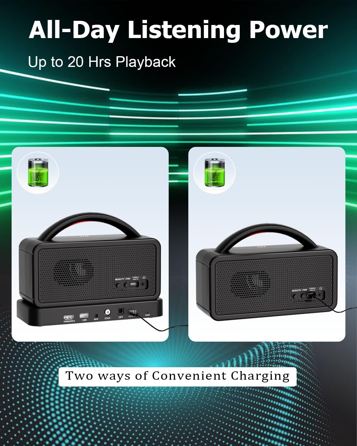 - 【 Dual Charging Methods & Long Battery Life 】Recharge using the docking base or a power adapter. A full charge delivers up to 20 hours of playback (at 50% volume). Simple plug-and-play setup gets you enjoying your shows in no time