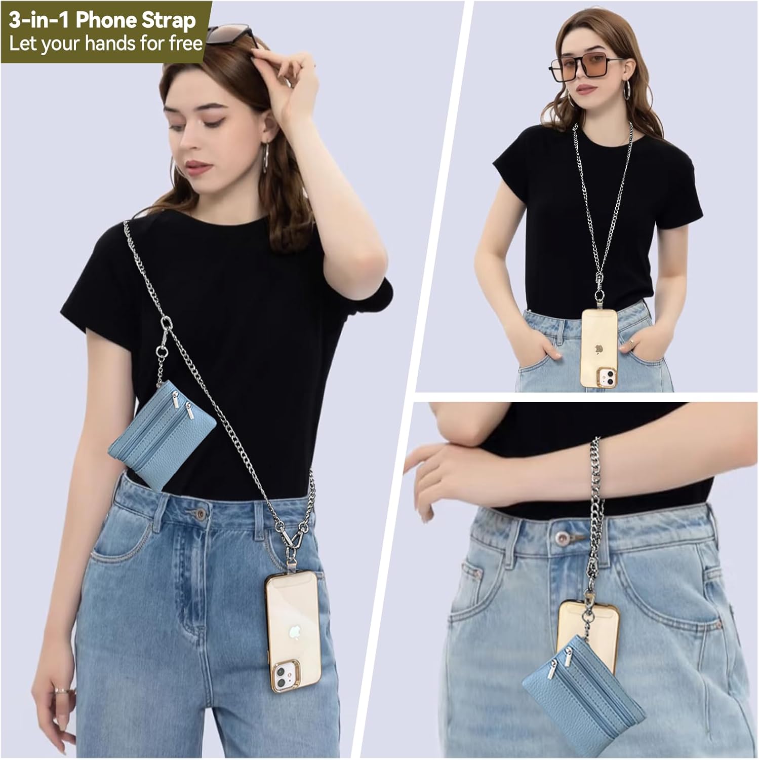 Clip and Go Strap for Phone Silver Metal Chain with Blue Pouch Wallet Crossbody Phone Lanyard for Women with Cell Phone Stand Holder 2 Patches Tether Adjustable Anti Theft for iPhone 16 15 All Phones