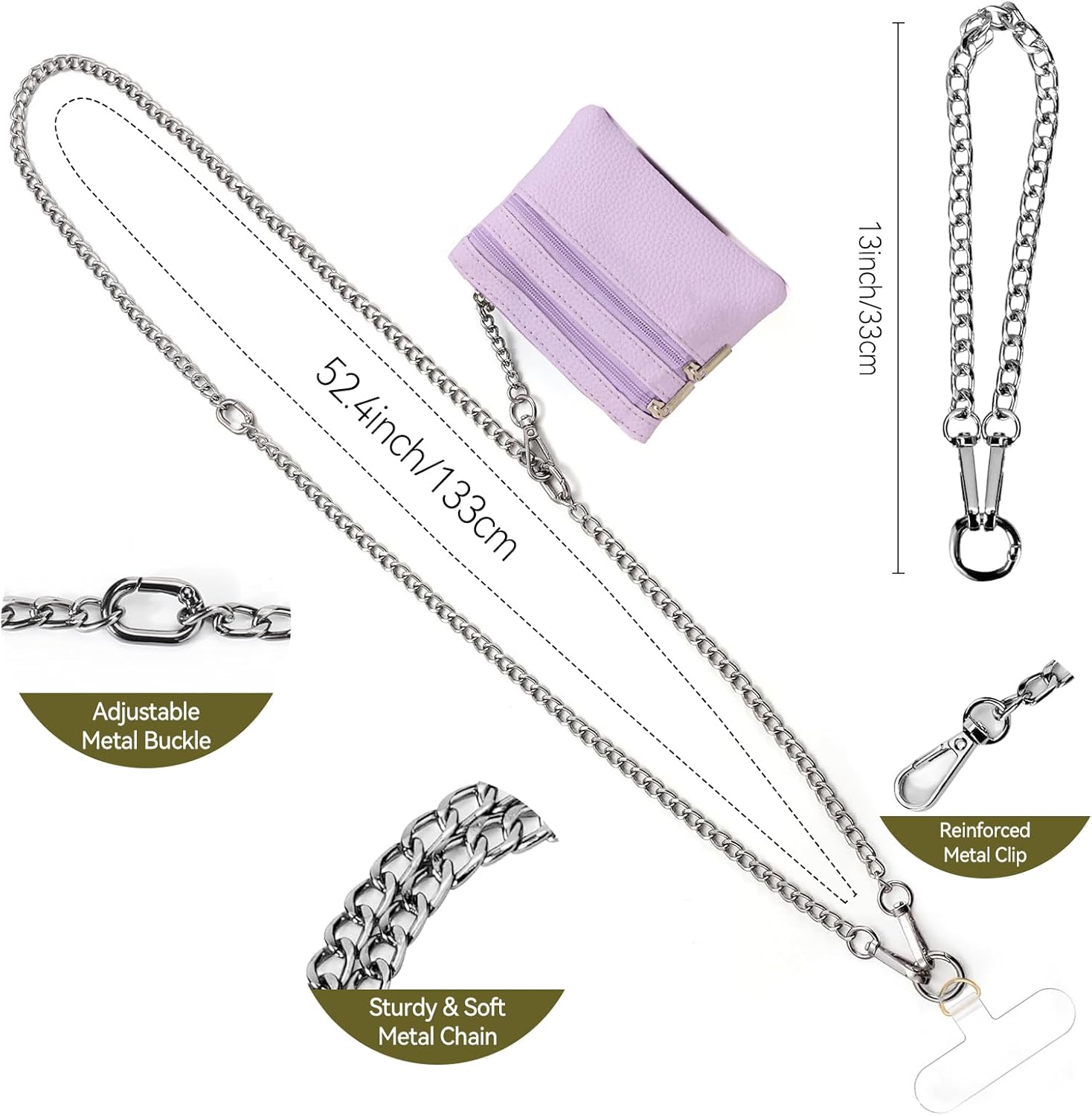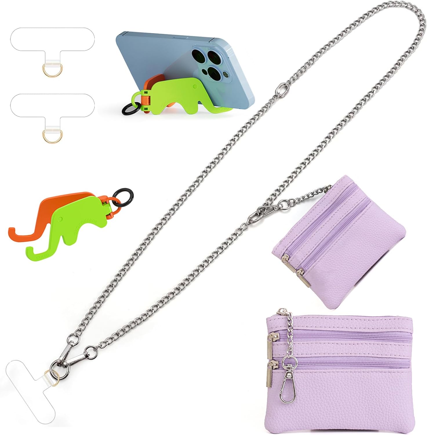 Clip and Go Strap for Phone Silver Metal Chain with Purple Pouch Wallet Crossbody Phone Lanyard for Women with Cell Phone Stand Holder 2 Patches Tether Adjustable Anti Theft for iPhone 16 Pro 15 All