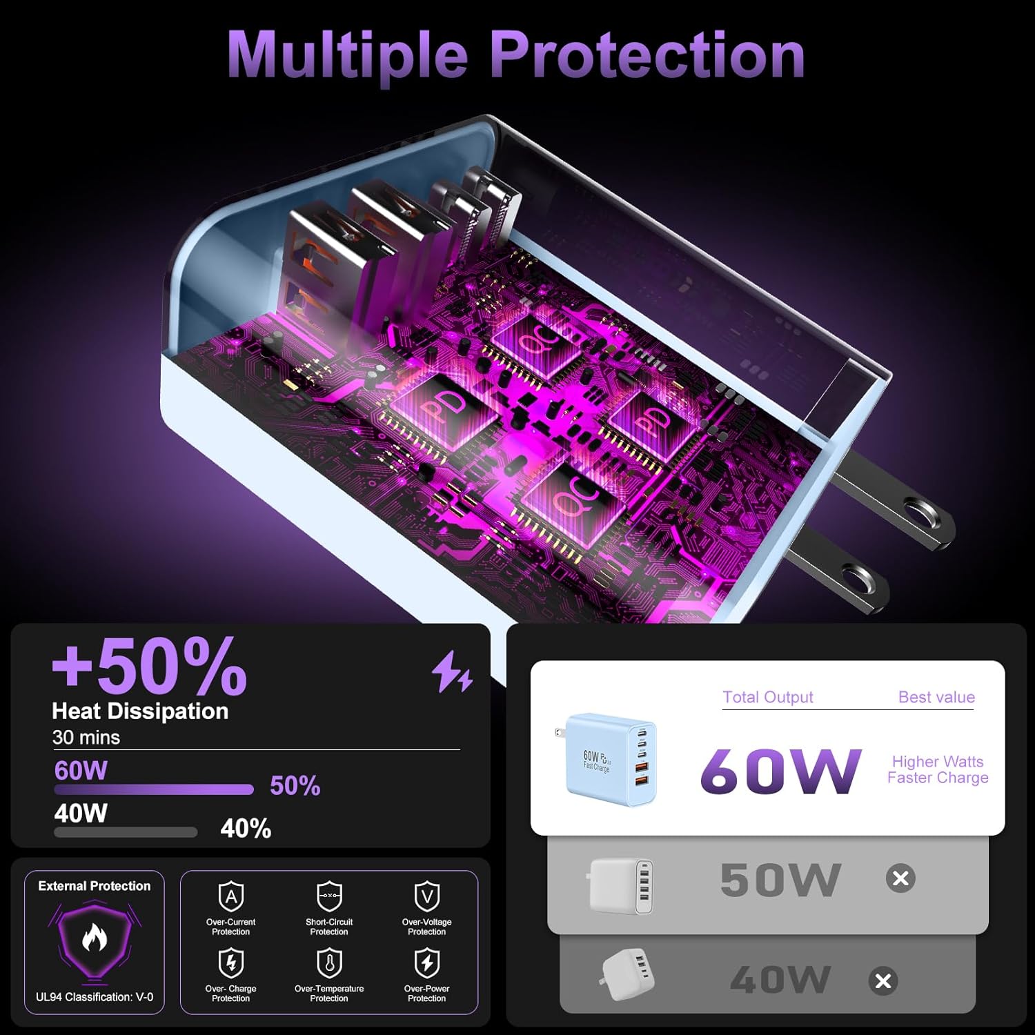 USB C Fast Wall Charger Block, 2Pack 60W USBC Charging Cubes, 5-Port PD+QC Power Adapter Multiport Brick Type C Box Plug for Phone 16/15/14/13/12/11/Pro Max/Plus, Pad Mini/Pro/S25/S24-Blue