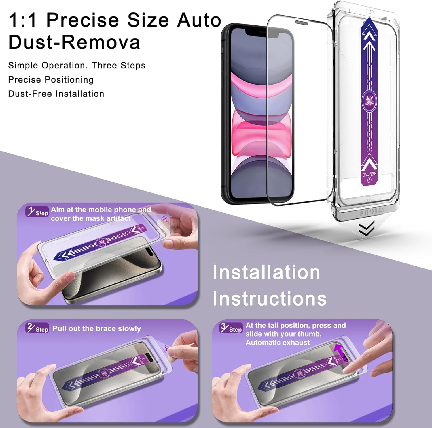- Auto Dust Removal & Easy Alignment: This iPhone 11 / iPhon XR screen protector is designed with advanced auto dust removal and self-aligning technology to ensure a flawless, bubble-free installation every time. Simply place the alignment frame on your phone, pull the tab gently, then press and slide to push out any remaining air. The process is quick and hassle-free. For the best results, we recommend watching our step-by-step installation video before getting started