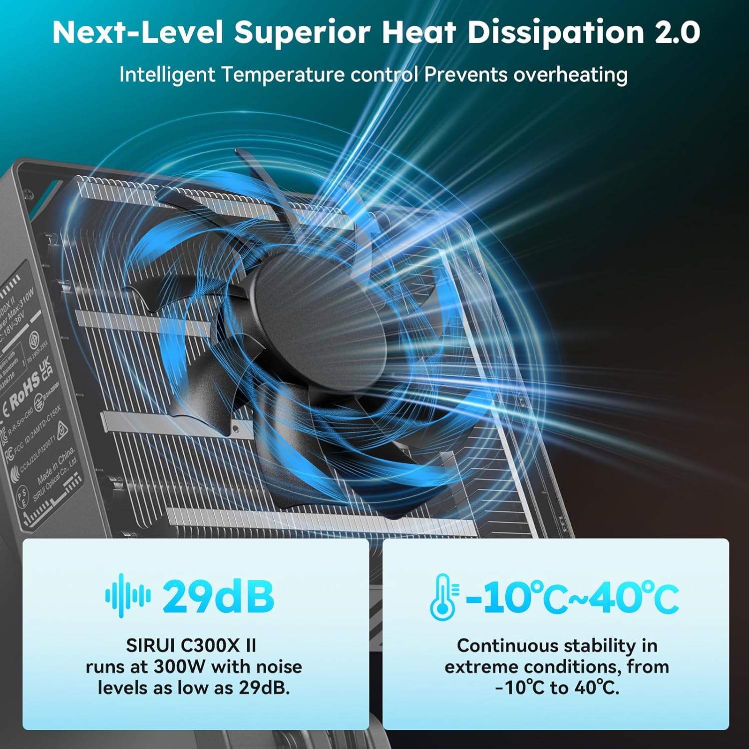 - Multi-Power Solutions for Any Scenario Flexible power options: AC 100-240V (indoor), DC 18-36V via V-Mount batteries, or SIRUI Battery Grip (sold separately). Auto-adjusts wattage (30W/100W/200W/250W/300W) based on voltage input.