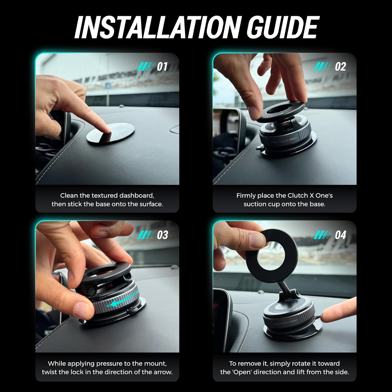 - Use included base plate - Suction cup works best on smooth, flat surfaces, but for textured or leather dashboards, simply stick the included adhesive base plate first for secure mounting.