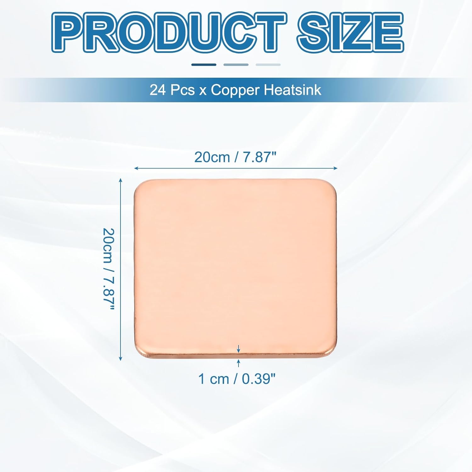 - Color: Copper Tone; Material: Copper; Size: 20 x 20 x 1 cm / 7.87 x 7.87 x 0.39 Inch (LxWxT); Package List: 24 Pcs x Copper Heatsink