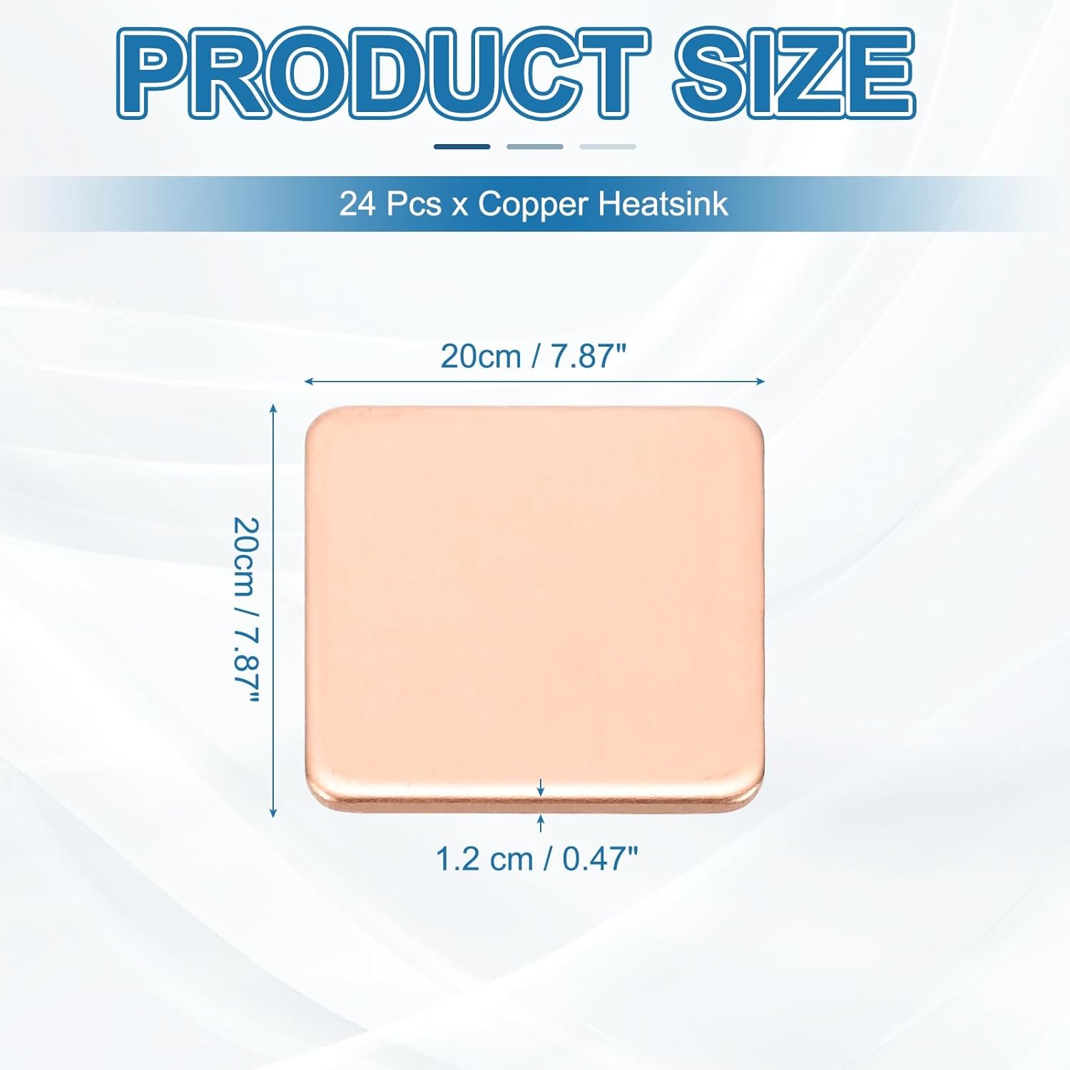 - Color: Copper Tone; Material: Copper; Size: 20 x 20 x 1.2 cm / 7.87 x 7.87 x 0.47 Inch (LxWxT); Package List: 24 Pcs x Copper Heatsink