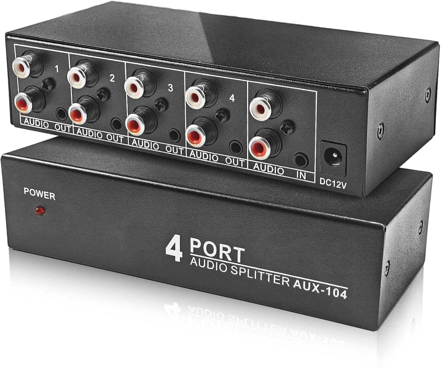 3.5mm Aux + RCA L/R Audio Splitter 1 in 4 Out, BolAAzuL 4-Way Stereo Audio Distributor Box 4-Channel Stereo RCA Splitter 1x4 for DVD Player, Game Console, Headphones, Speaker - w/Power