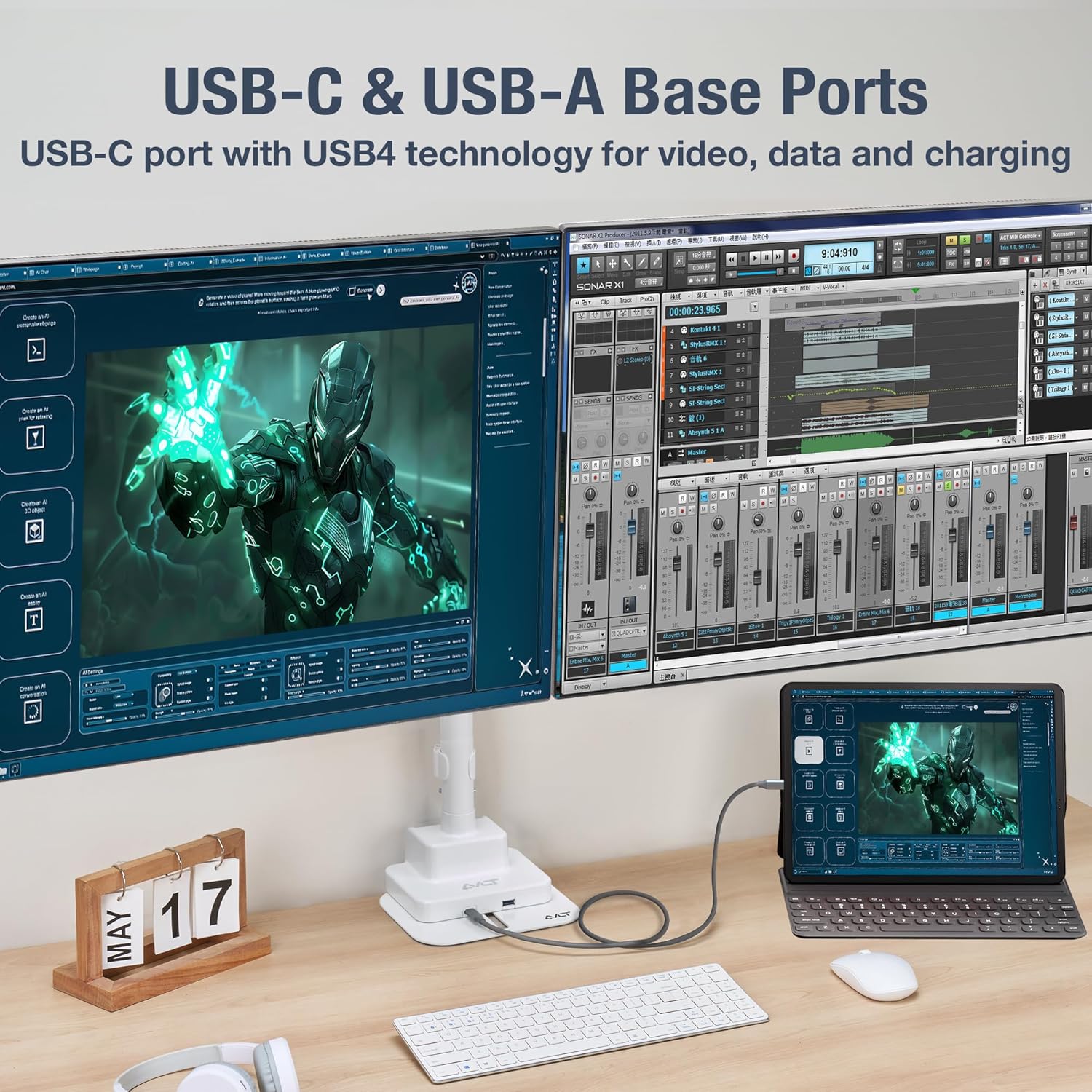 AVLT Dual 57 Inch Heavy Duty Stacking Monitor Arm Pole Top Mount With USB-C USB-A Ports-White, Height Adjustable, Easy Install Top C-Clamp/Grommet With Reinforcement Plates, VESA Compatible 200/100/75