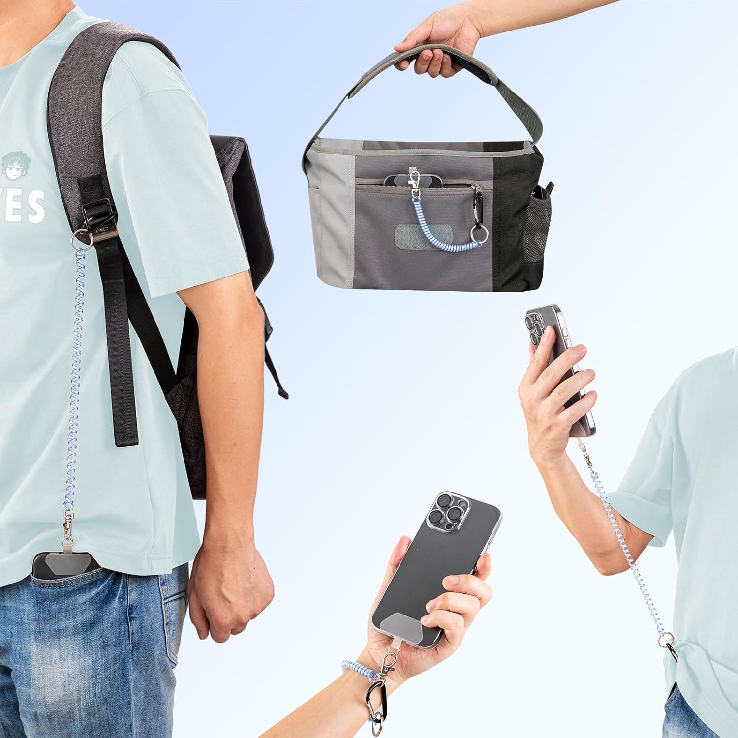 - Colorful Phone Tether: 1x Carabiner, 4x Pads and 2x Spring phone tether. The anti theft phone strap allows for easy attachment to backpacks, belts, or wrists, providing convenient access to your phone while keeping it close at hand
