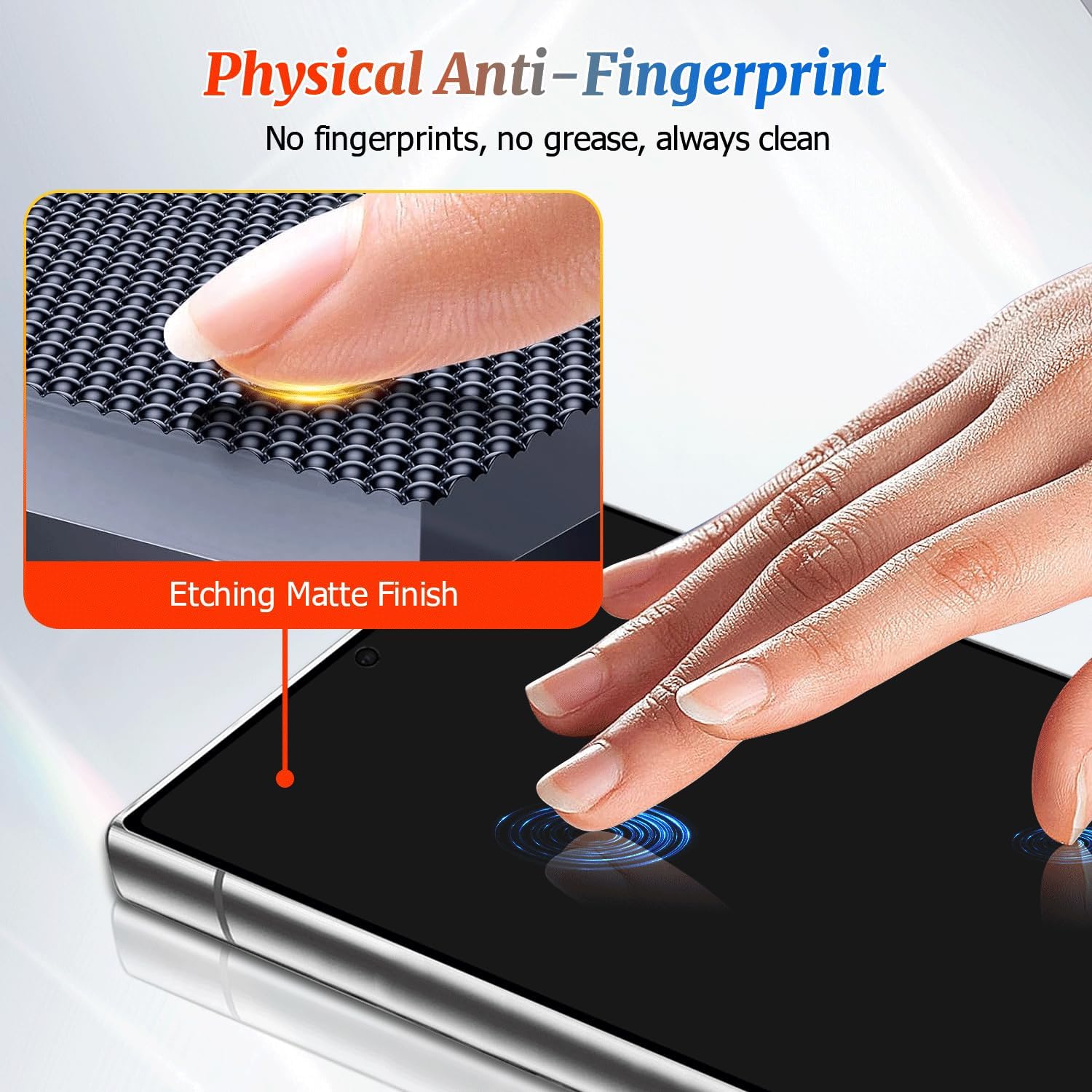 - ANTI-GLARE MATTEFINISH:For Galaxy S24 Ultra screen protector Privacy Matte finish reduces reflections and glare as well as reduces fingerprints and smudges on the screen. After installing this Galaxy S24 Ultra matte Anti spy privacy screen protector, Reading in strong sunlight, outdoors or in light, is not dazzling and reducing your eye strain.When using this S24 Ultra Matte tempered glass film, you can enjoy a silky touch and feel, and it is not easy to leave fingerprints. The surface of the tempered film is easier to clean.