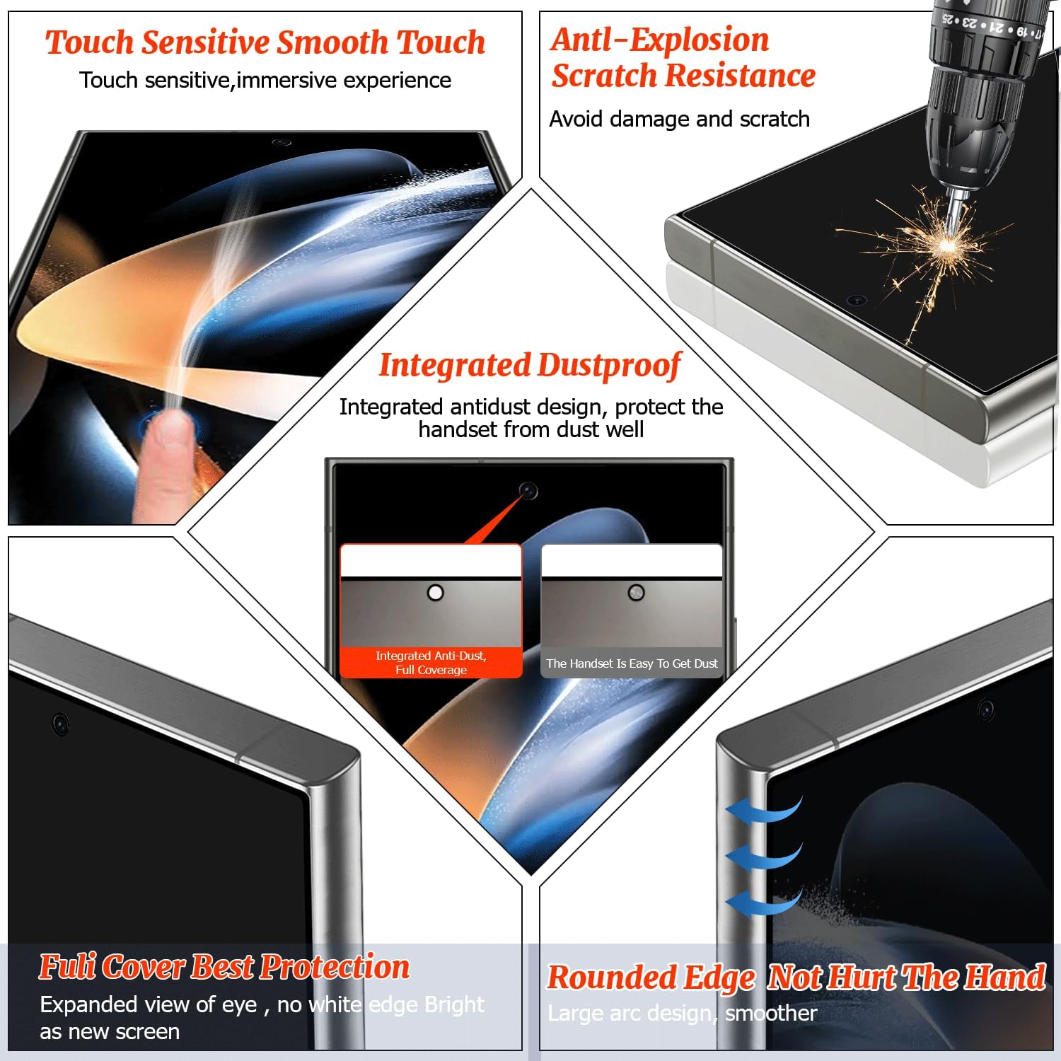 - SMOOTH TOUCH SENSITVITY: galaxy S24 Ultra screen protector should maintain the phone's touch sensitivity and not interfere with the user's ability to interact with the screen. It has a smooth, responsive touch like the original screen.We use Nano technology to ensure that there is no graininess on the screen. No interfere with any functions, includes Fingerprint unlock recognition, taking selfies and etc.We recommend that you have your fingerprints redone after installing the screen protector.Registering the same fingerprint twice can unlock more sensitively and quickly.