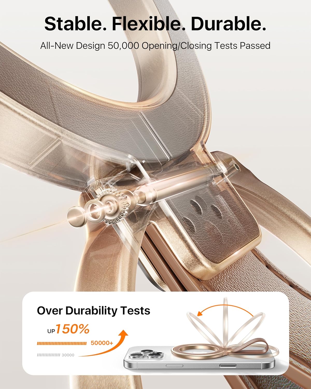 - [Upgraded Hinge System – Smooth Open & Military-Grade Durability] Our MagSafe ring grip with a premium zinc alloy hinge and precision-tuned resistance, delivering ultra-smooth, effortless angle adjustments with every flip. It withstands over 50,000 open/close cycles without loosening, ensuring long-lasting durability and flawless positioning for both portrait and landscape views. Whether you're binge-watching, video calling, or multitasking, this magnetic phone holder guarantees reliable performance day after day