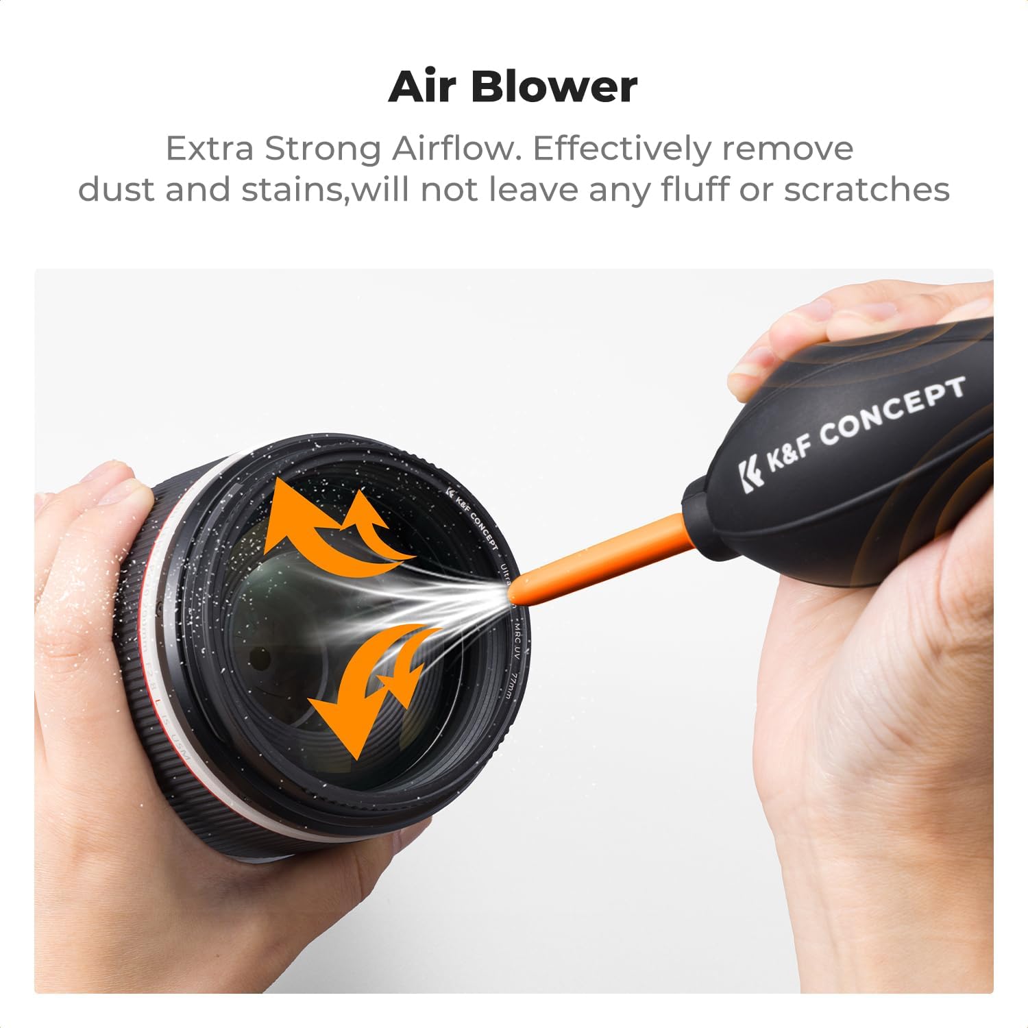 - ✨Air Blower + Lens Pen✨ The camera dust blower will direct a stream of air to blow away dirt and dust from your lenses or camera sensor. Lens cleaning pen can gently remove dirt and dust on hard-to-reach areas.