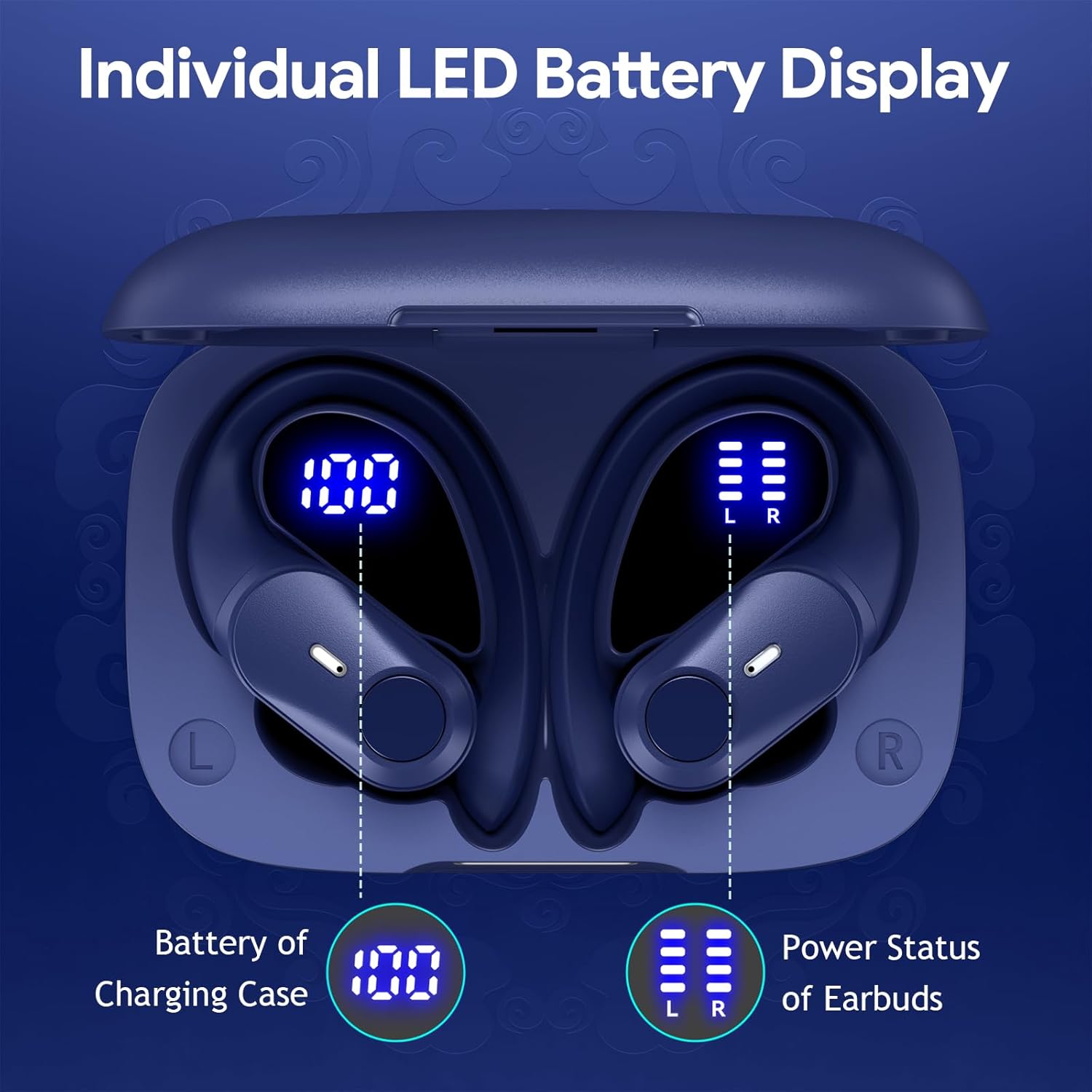 GOLREX Active Noise Cancelling Ear Buds Wireless Earbuds Bluetooth Headphones with 80H Playtime LED Display Wireless Charging Case, Over-Ear Hooks Earbud for Sports Running Gym Workout Blue