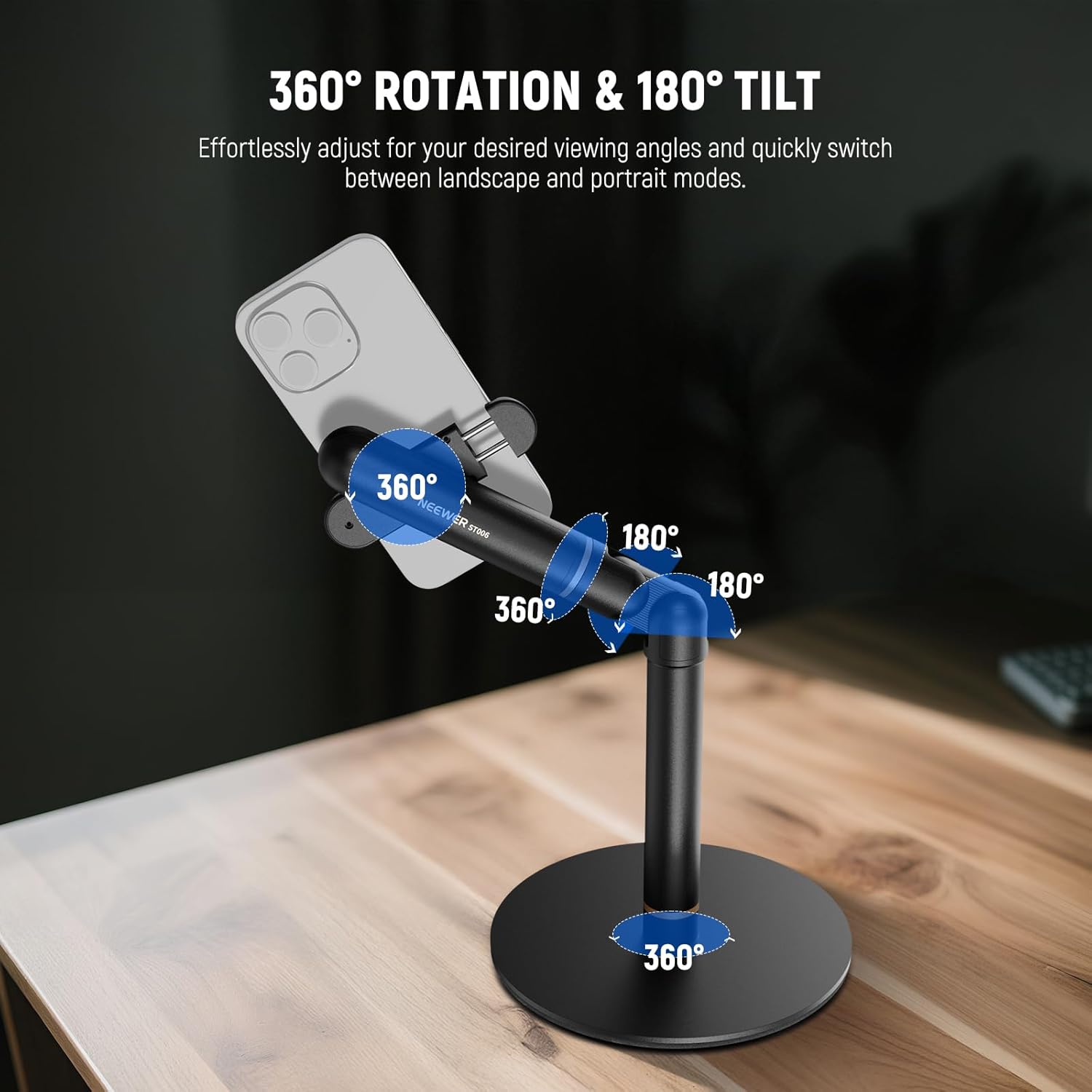 - 【360° Rotation & 180° Tilt】 With a remarkable 180° tilt and a full 360° rotation, the cell phone stand allows for effortless angle adjustments and quick switching between landscape and portrait modes, providing optimal angles for watching videos, cooking from a recipe, or participating in video calls