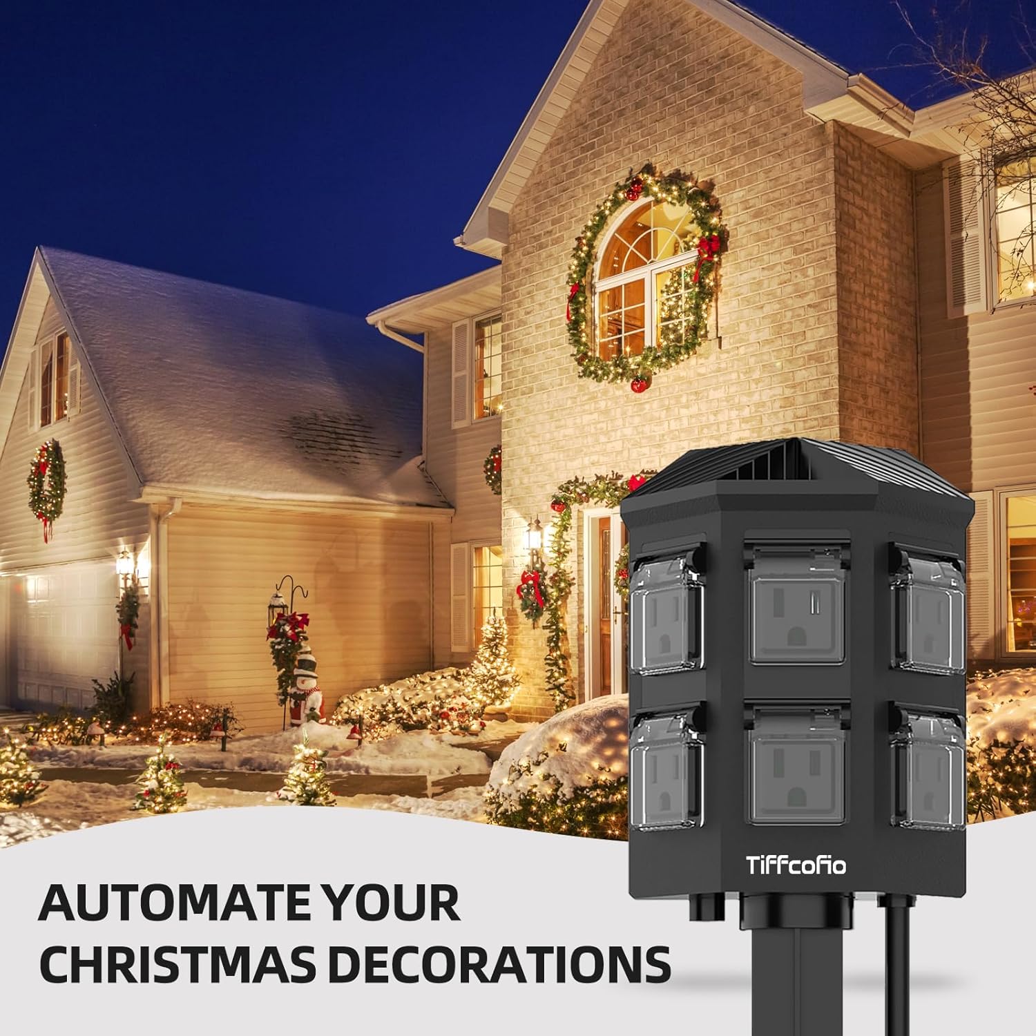 TiFFCOFiO Outdoor Power Strip Timer, Dusk to Dawn Light Sensor Countdown, 50 Feet Extension Cord Waterproof, 6 Grounded Outlets for Halloween and Christmas Decorations, ETL Listed (50 FT)