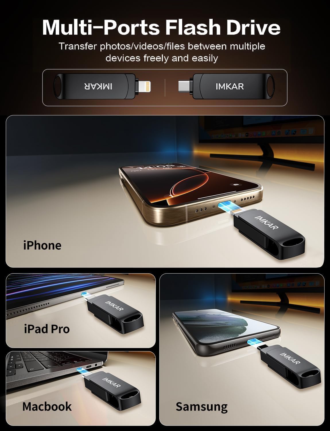 - 【Multi-Port USB Drive】The 3 IN 1 phone photo stick with USB-C Port/ USB-L Port/ USB Port (Independent interface), which is more convenient for data transfer between different devices, so as to get rid of the data cable and iTunes and iCloud, let you switch easily storage space. The Phone thumb drive is designed for use with a wide range of devices, Compatibility iPhone 16/15/14/13/12/11/8/7/6S/SE/XR/XS/XS Max/X Series/iPad Air Series/iPad Pro Series. Also support Android smartphones/Computers and other devices with USB-C Ports. (Tip: For iPhone system version requires iOS 13 or higher, For Android smartphones need to open OTG function)
