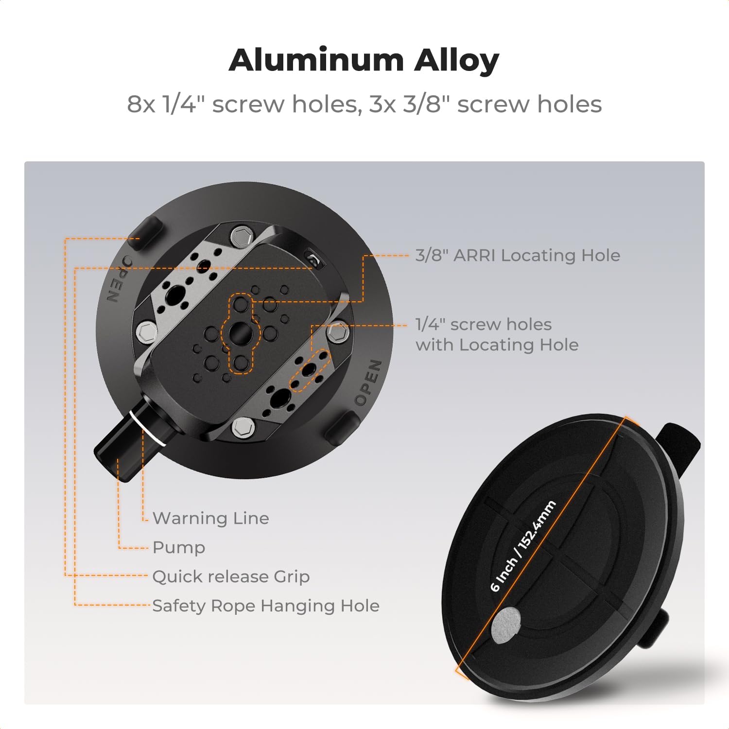 - [Superior Suction Power] - K&F Concept Powerful Suction Cup Equipped with 6-inch (152mm) rubber large suction cups, it can be firmly adsorbed on smooth, flat, non-porous surfaces, such as car glass, hood, body sides, tiles, wooden table tops, etc., providing stable support for shooting and dramatically improving shooting flexibility. Recommended load-bearing equipment in motion: 3kg, suction cup horizontal suction force up to 60kg, vertical suction force 40kg.