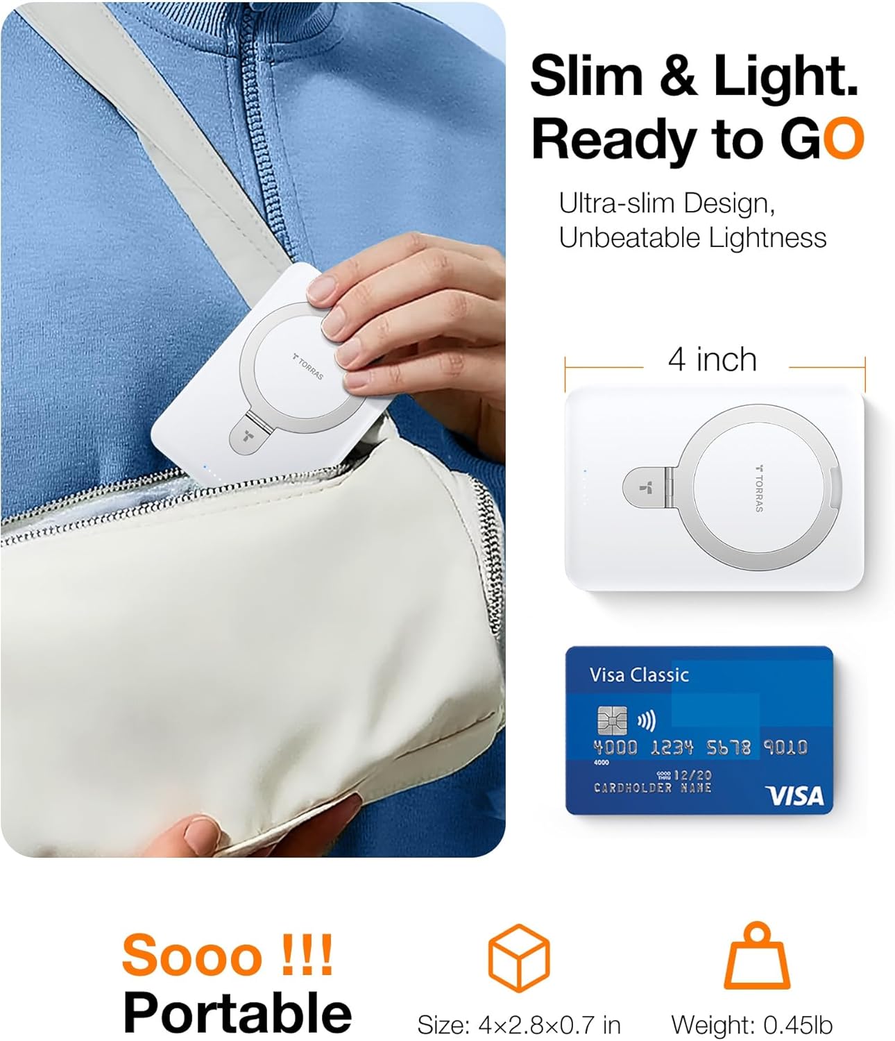 TORRAS 10000mAh Magnetic Portable Charger Power Bank for iPhone, Fast Charging Travel Essential Wireless Battery Pack Slim with OStand Compatible with Magsafe, 16 Pro Max,Pro,15,14,13,12, White