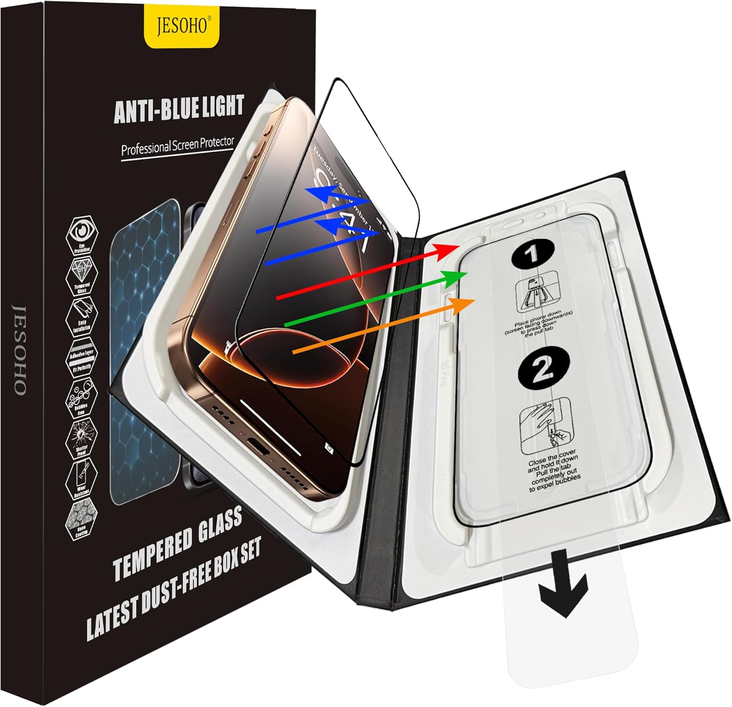 - Easy align installation:This screen protector is equipped with the newest smart alignment tray. Just put your phone into the tray with JESOHO screen protector. Close the cover, press it steady and pull the tab out slowly. It can automatically eliminate bubbles