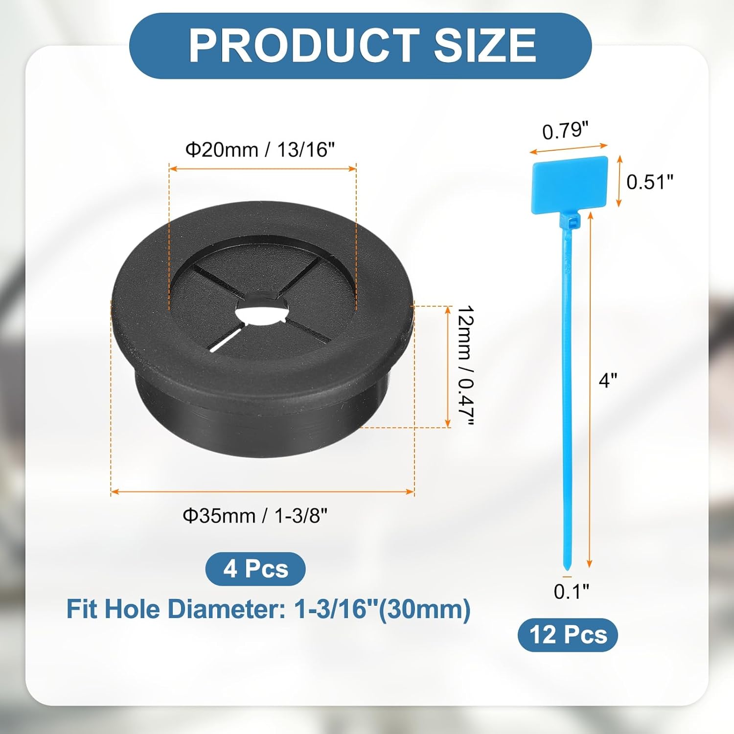 - Package Includes: You will receive 4pcs rubber grommets for cables and 12pcs marked cable ties. The rubber grommet fitting perfectly into 1-3/16 inch (30mm) holes, can pass through any cable less than 13/16 inch (20mm) diameter