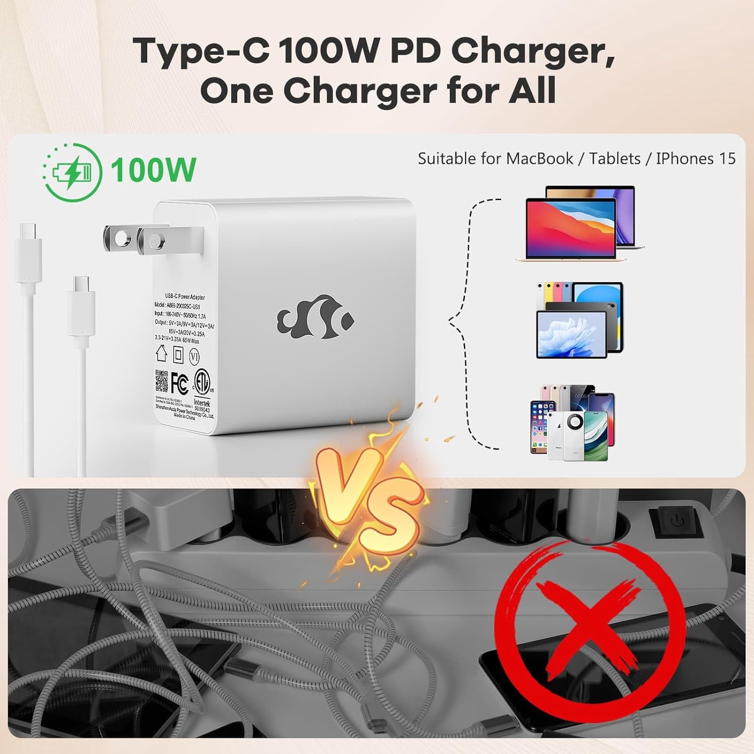 - 【Type-C GaN 100W PD Fast Charger】Travel confidently with our compact 100W USB-C PD fast charger and 6.56ft cable. A 15-minute charge provides up to 2 hours of standby time. Compatible with multiple devices, this charger simplifies your travel setup.
