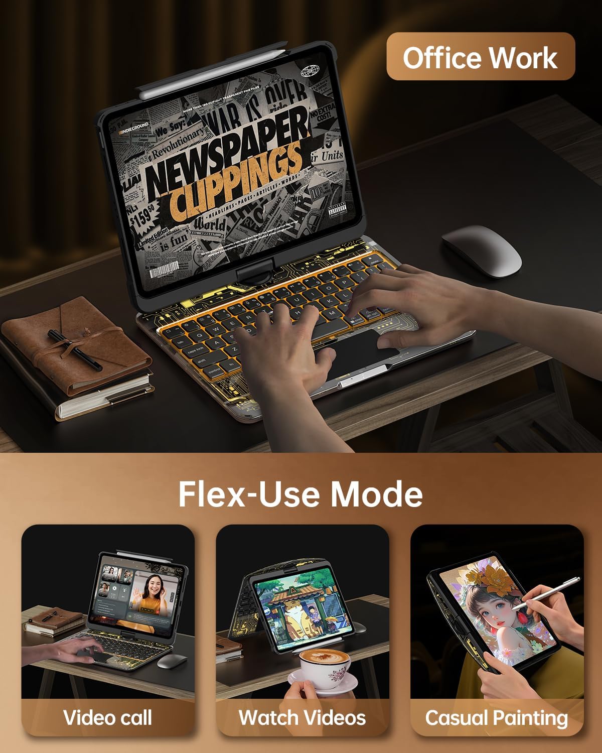 - Special Feature : 360° horizontal rotation & 180° opening-closing, 7-Color Keyboard Backlight with 3-Level Brightness Adjustment, Clear back showcases iPad logo, Hotkeys and Media Keys, Multi-Gesture Touchpad 360° horizontal rotation & 180° opening-closing, 7-Color Keyboard Backlight with 3-Level Brightness Adjustment, Clear back showcases iPad logo, Hot… See more