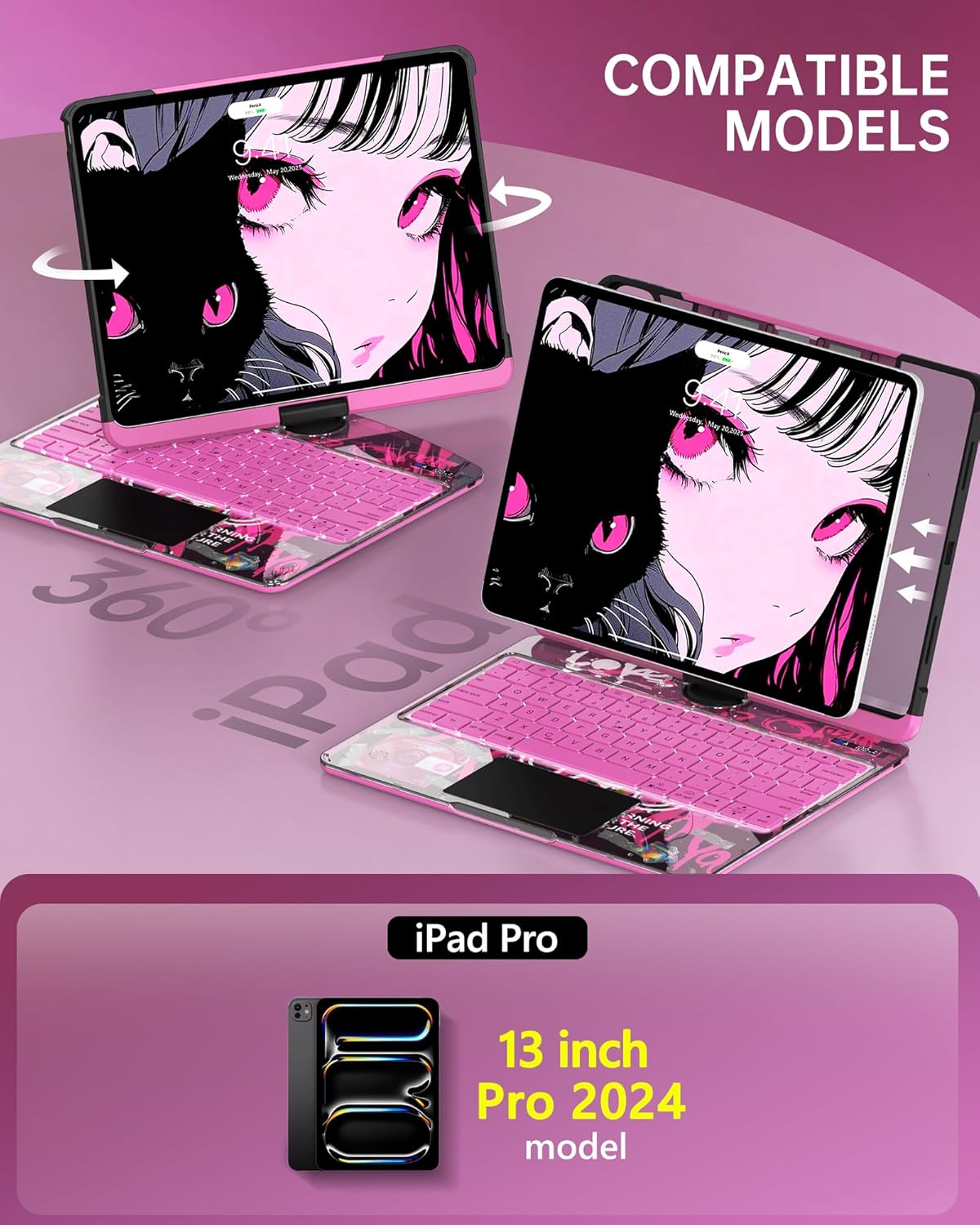 Intermerge Clear Keyboard Case for iPad Pro 13" (M4) 2024 Only, 360° Swivel Multi-Touch Trackpad, 7-Color RGB Backlit, Pencil Holder, Type-C, Power Indicator, Blush Pulse