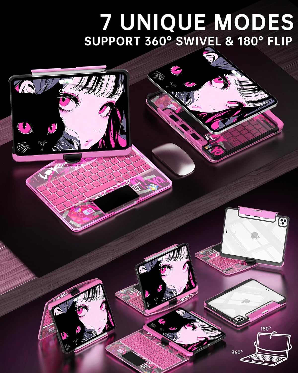 - Special Feature : 360° horizontal rotation & 180° opening-closing, 7-Color Keyboard Backlight with 3-Level Brightness Adjustment, Clear back showcases iPad logo, Hotkeys and Media Keys, Multi-Gesture Touchpad 360° horizontal rotation & 180° opening-closing, 7-Color Keyboard Backlight with 3-Level Brightness Adjustment, Clear back showcases iPad logo, Hot… See more