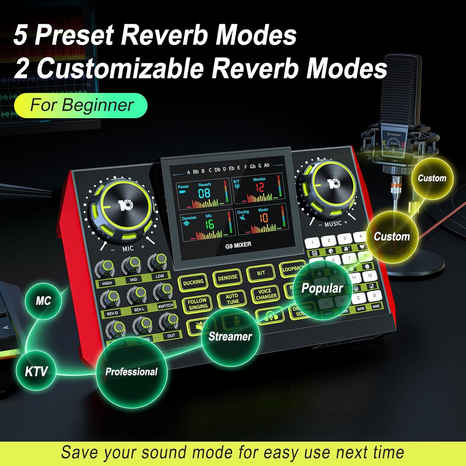 - 【5 Built-in + 2 Custom Reverb Modes, Perfect for Beginners】Whether you’re recording vocals or instruments, live streaming equipment offers 5 preset reverb modes that you can adjust to match your sound. Get a professional audio effect with ease, perfect for live streaming, podcasts, and more.