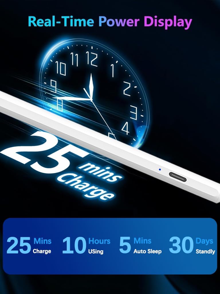 - 🖊【25 Minutes Fast Charging & Long Use Time】 This iPad pencil charges fully in 25 minutes and allows 10 hours of continuous use. It auto shuts down after 5 mins of inactivity to save power, flashing in the last minute of the 5-minute sleep mode and stops when picked up.
