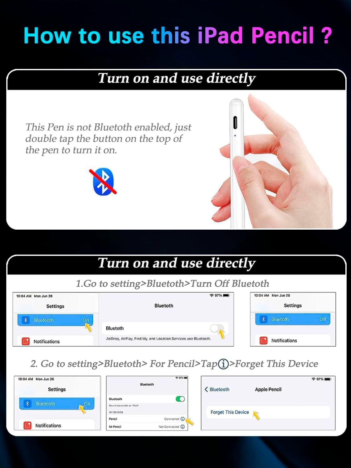 - 🖊【Easy to Use】PLEASE NOTE: The stylus pen doesn't have Bluetooth. Double-click the top of the ipad stylus to turn on/off easily without connecting Bluetooth. If you find pen for ipad doesn't work after turning on, please turn off Bluetooth: Settings > Bluetooth > Turn off Bluetooth, or follow the steps to disconnect the Bluetooth connection between your iPad and for Apple Pencil: Settings > Bluetooth > for Apple Pencil > tap "i" > Forget this device.