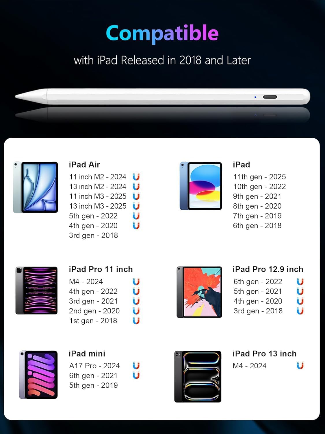- 🖊【Compatibility Check needed】This Stylus is ONLY compatible with ipads released in 2018 or Later. Here are all compatible Model: iPad A16/10th/9th/8th/7th/6th, iPad Pro 13" (M4), iPad Pro 12.9"(3rd/4th/5th/6th), iPad Pro 11"(All Generations), iPad Air M3/M2/5th/4th/3rd Gen, iPad Mini A17 Pro/6th/5th Gen.Note: **Please go to Setting>General>About to confirm your iPad's model before placing order.