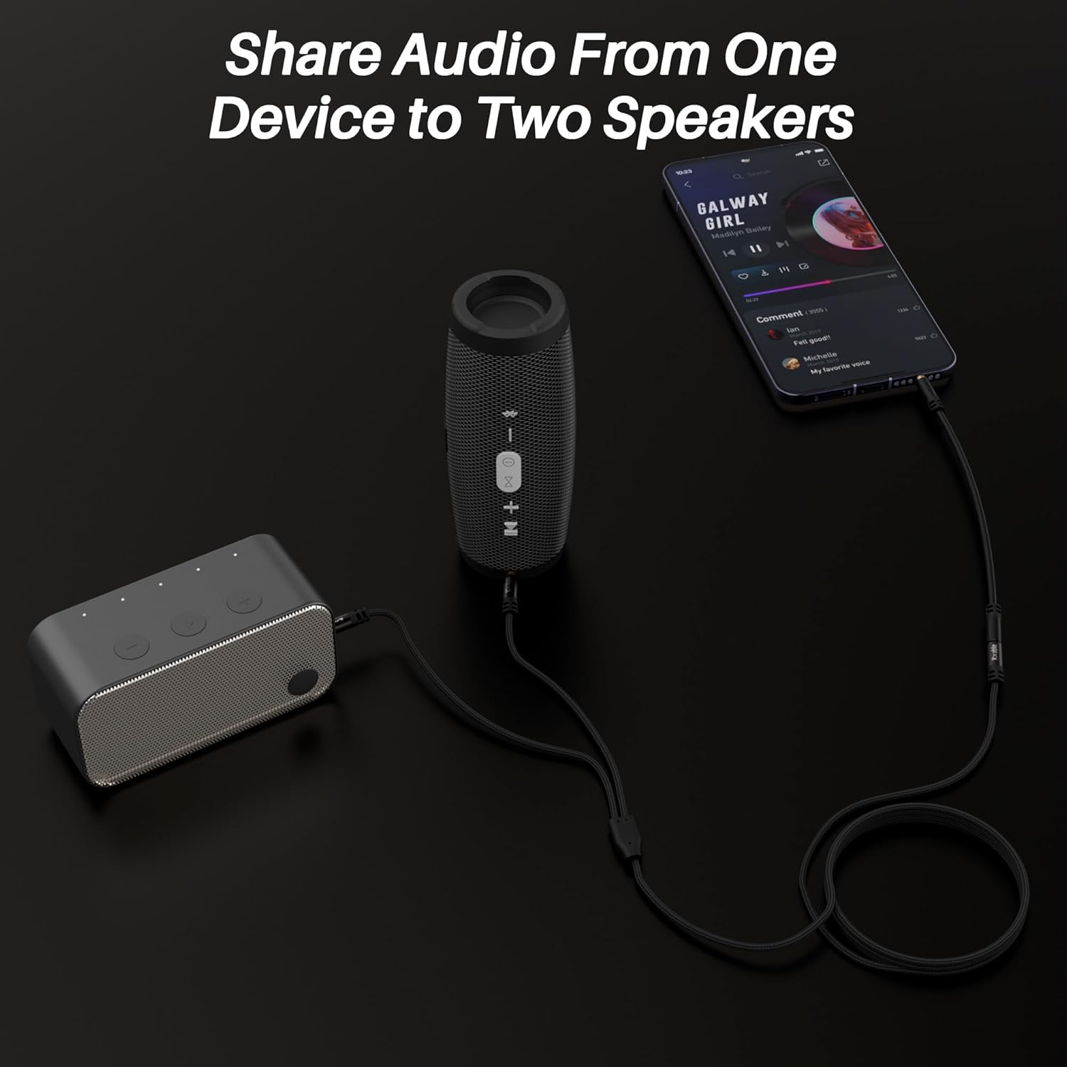 - 【TRS Splitter Audio Cable】:This 1/8inch splitter cable connects 2 separate audio play devices to headphone or speaker, seamlessly switching between two audio sources to one speaker without frequent cable replacement to avoid frequent plugging and unplugging. Note: due to the close distance between the two male plugs (approximately 1FT), it is not recommended to insert both headphones at the same time.