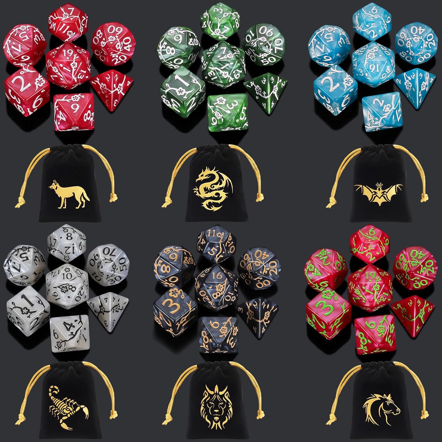 - Durable and Portable: The polyhedral game dices are made from acrylic, durable and lightweight; Comes with 6 pouches in different gold animal prints; Pouch size is 3.54 x 2.95 in, convenient to store and carry