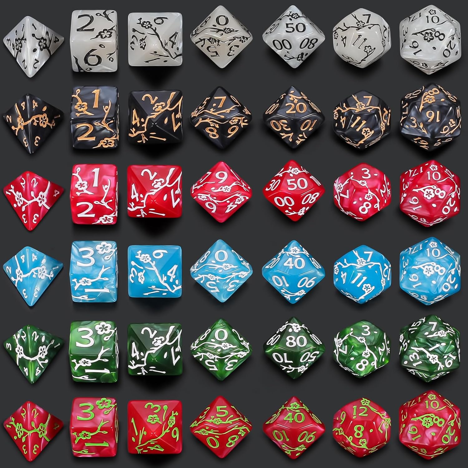 CiaraQ Polyhedral Dice Set (42pc) with 6 Drawstring Dice Pouches for Dungeons and Dragons RPG MTG Table Games. 6 Sets of Plum Blossom Pattern Role Playing Dice