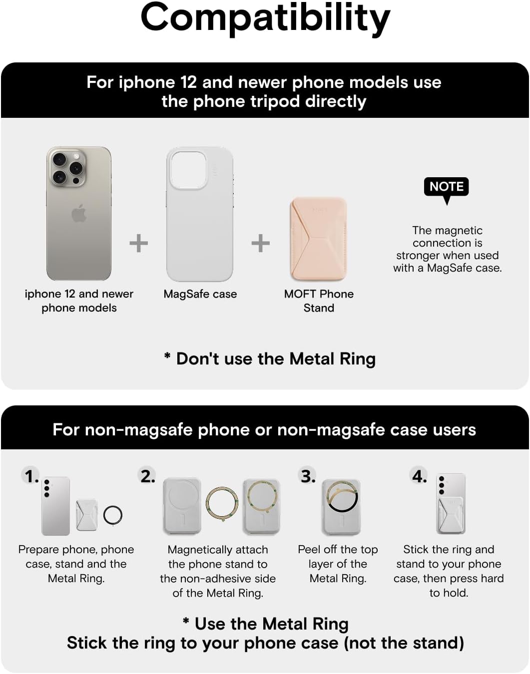 - Compatible Phone Models : iPhone 16/ iPhone 16 Plus/ iPhone 16 Pro/ iPhone 16 Pro Max/iPhone 16/ iPhone 15 Plus/ iPhone 15 Pro/ iPhone 15 Pro Max/ iPhone 14/ iPhone 14 Plus/ iPhone 14 Pro/ iPhone 14 Pro Max/ iPhone 13/ iPhone 13 mini/ iPhone 13 Pro/ iPhone 13 Pro Max/ iPhone 12/ iPhone 12 mini/ iPhone 12 Pro/ iPhone 12 Pro Max and MagSafe cases, non-MagSafe iPhone and non-silicone phone cases with an included MOFT Metal Ring, Universal with other phone models including Android iPhone 16/ iPhone 16 Plus/ iPhone 16 Pro/ iPhone 16 Pro Max/iPhone 16/ iPhone 15 Plus/ iPhone 15 Pro/ iPhone 15 Pro Max/ iPhone 14/ iPhone 14 Plus/ iPhone 14 Pro/ iPhone 14 Pro Max/ iPhone 13/ iPhone… See more