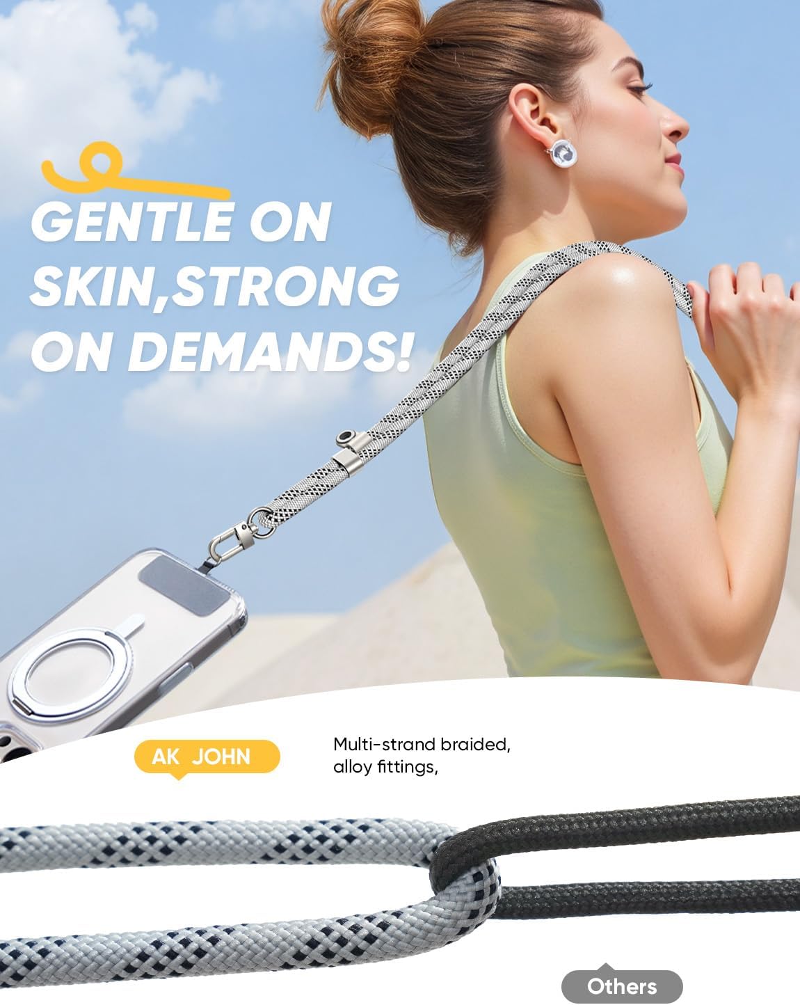 - Universal Phone Compatibility: Works seamlessly with iPhone series (even with a full cover shockproof case), Samsung S25-S23, GoPro, and cameras. This phone lanyard is designed to never block charging ports, allowing you to charge your device while wearing it.