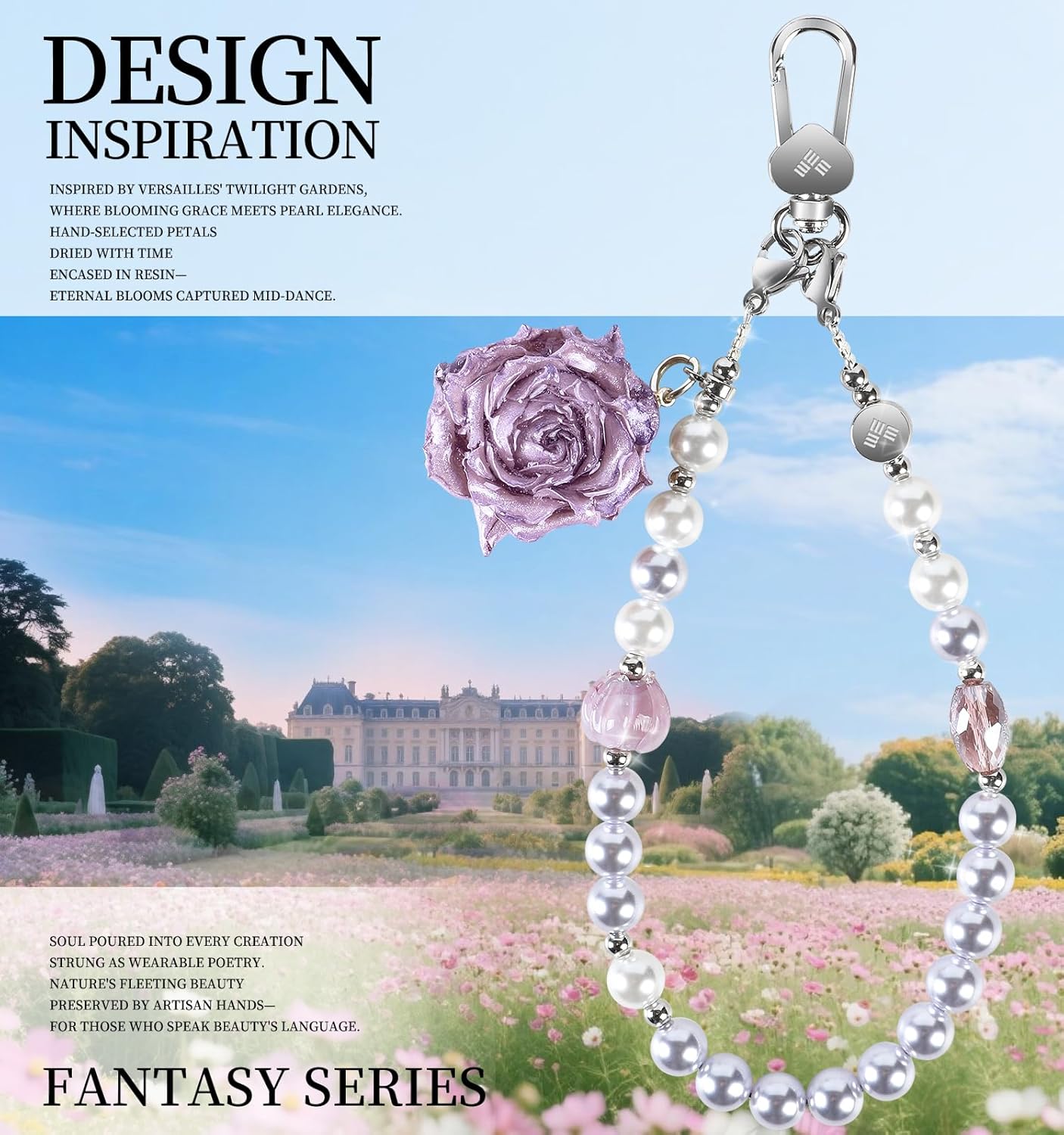 • memumi Fantasy Series: Inspired by Versailles' twilight gardens, where blooming grace meets pearl elegance. Hand-selected petals, dried with time, encased in resin, eternal blooms captured mid-dance. Soul poured into every creation, strung as wearable poetry. Nature's fleeting beauty, preserved by artisan hands. For those who speak beauty's language.