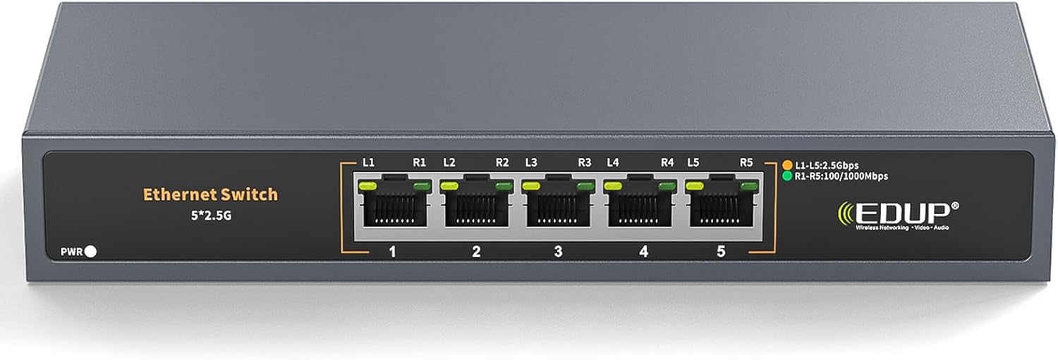 - 🚀 Ultra-Fast 2.5G Network Switch – 5 Multi-Gig Ports Upgrade to lightning-fast speeds with 8×2.5 Gigabit RJ45 ports—2.5X faster than traditional Gigabit switches. With up to 40 Gbps switching capacity, it's ideal for gaming, 4K streaming, and high-volume data transfers.