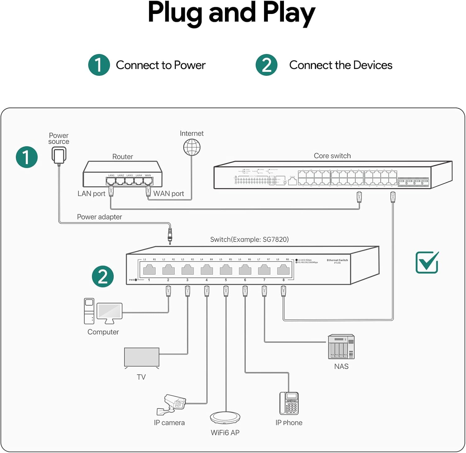 - 🔇 Silent Operation with Fanless Design Designed for whisper-quiet performance, this fanless Ethernet switch runs silently in any environment—perfect for home offices, bedrooms, and media rooms.