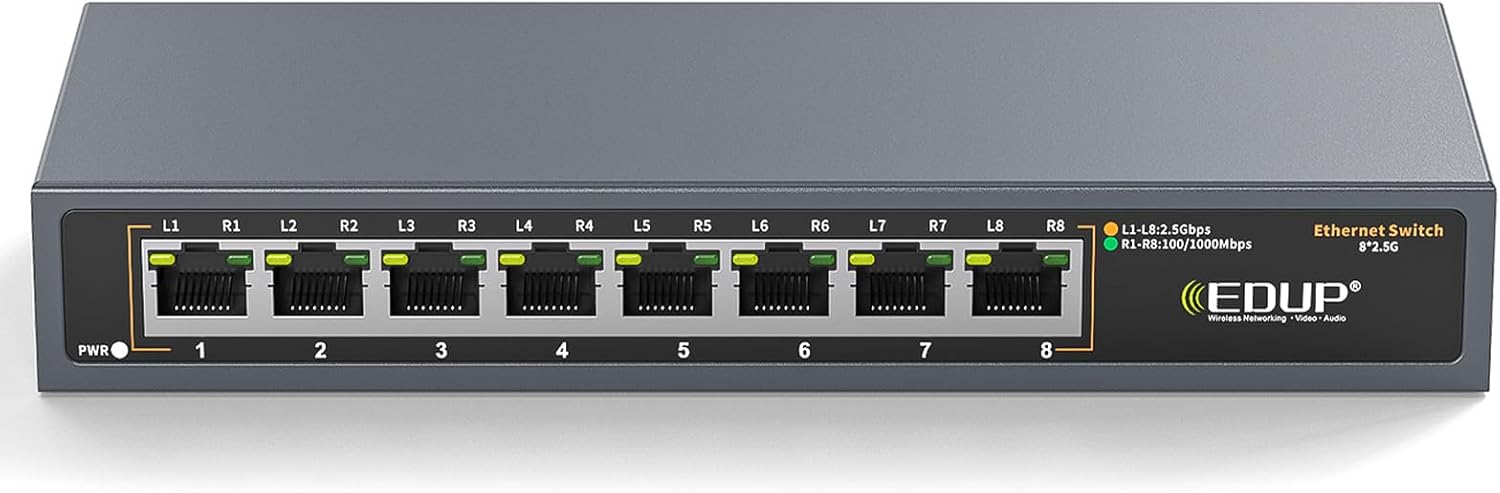 - 🚀 Ultra-Fast 2.5G Network Switch – 8 Multi-Gig Ports Upgrade to lightning-fast speeds with 8×2.5 Gigabit RJ45 ports—2.5X faster than traditional Gigabit switches. With up to 40 Gbps switching capacity, it's ideal for gaming, 4K streaming, and high-volume data transfers.