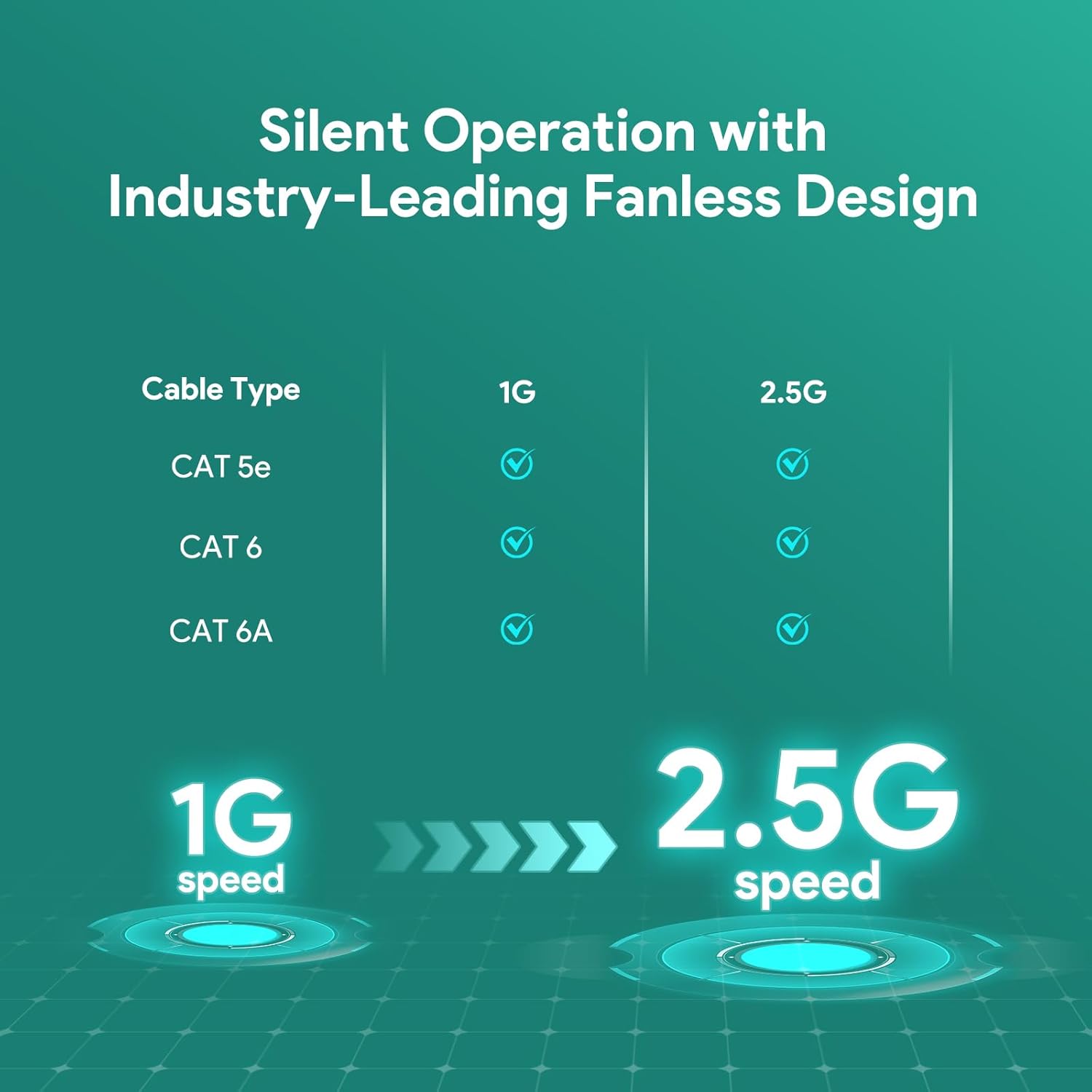 - 🔌 Plug & Play with Existing Cat5e Cables No software needed—just plug it in and go. Fully supports Cat5e Ethernet cables, saving you from upgrading to Cat6 while still enjoying multi-gig performance.