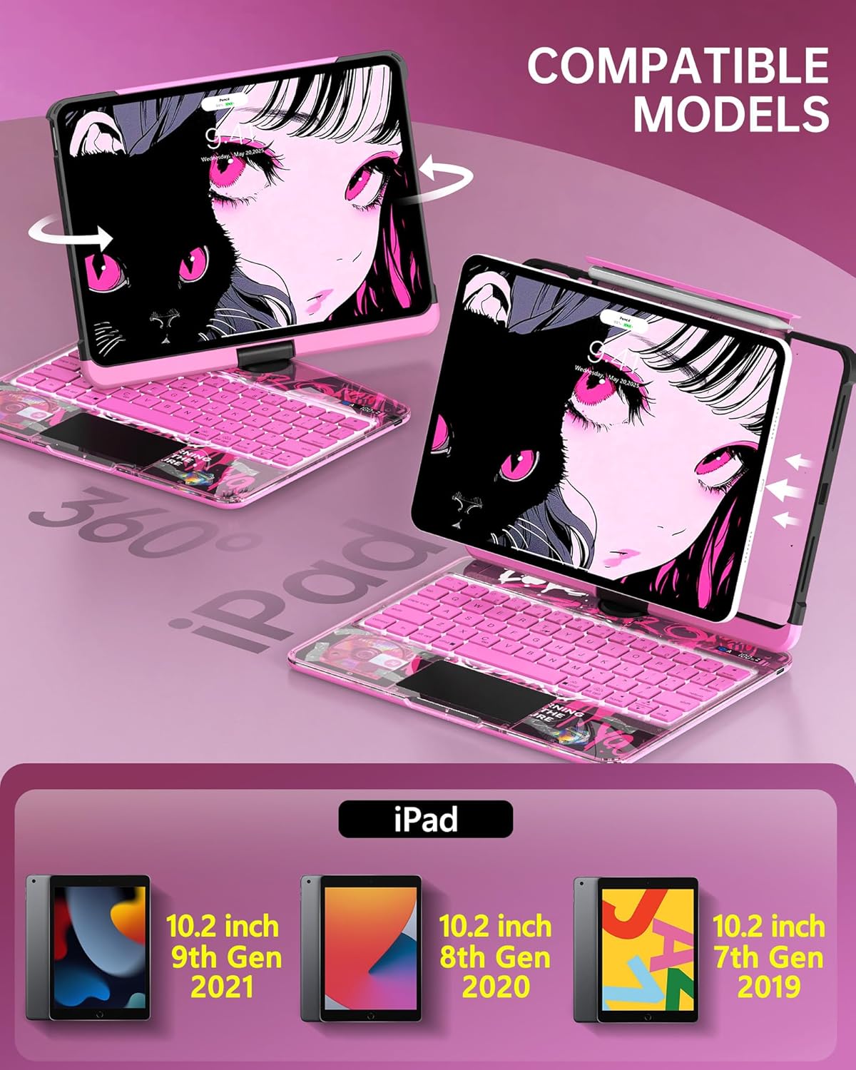 Intermerge for iPad 9th 10.2 inch Keyboard Case, 360° Transparent Multi-Touch Trackpad, 7-Color Backlit Keyboard, Pencil Holder, Type-C, Power Indicator for 9th/ 8th/ 7th - Blush Pulse